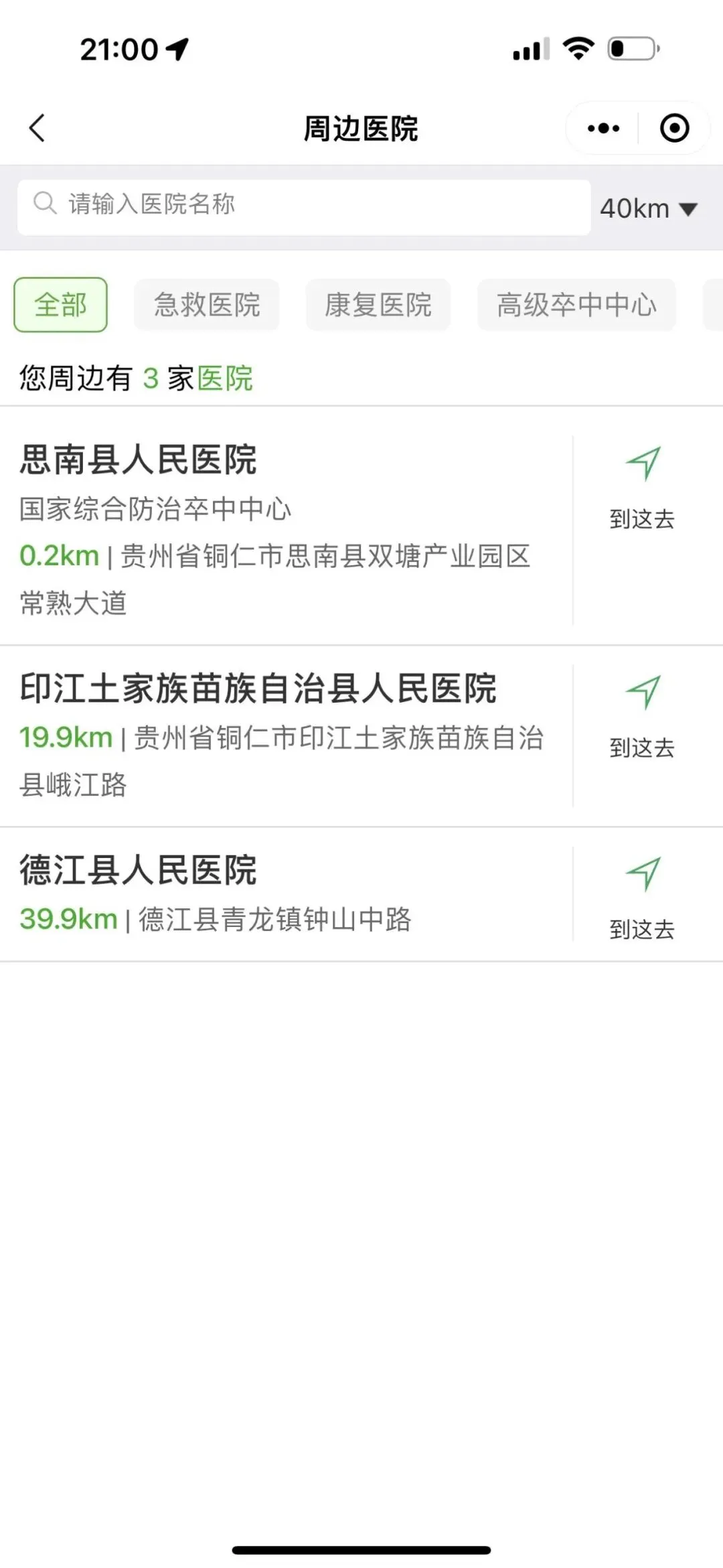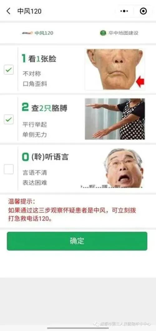 在“中风识别”中,大家能根据图片的提示勾选患者的发病情况进行卒中的识别,随后能在“选医院”中查询到距离自己最近的具有救治能力的医院并提供导航以引导自行前往医院,或者直接点击“拨打120”。