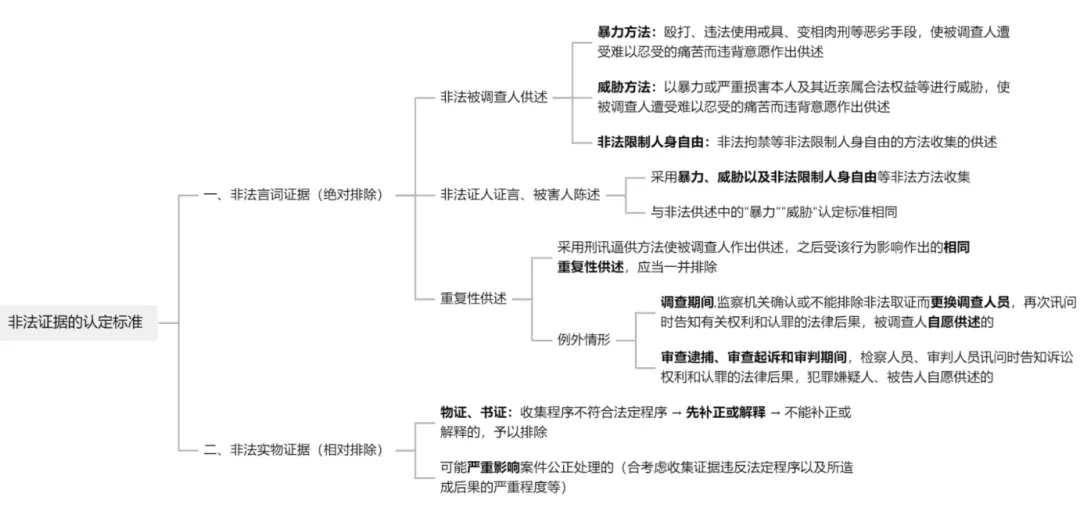 基于以上法律规范,可以将非法证据的认定标准以思维导图的形式归纳如下: