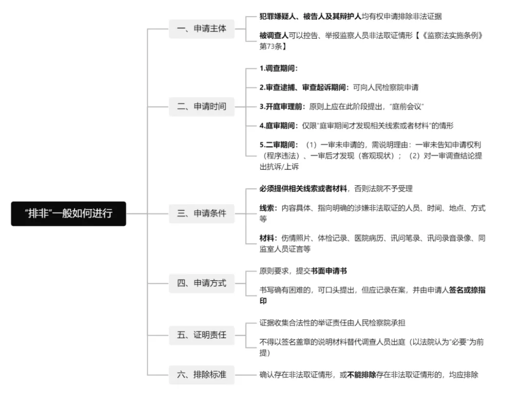 故本文以《办理刑事案件排除非法证据规程》为基础,将“排非”的申请方法同样以思维导图的形式归纳如下: