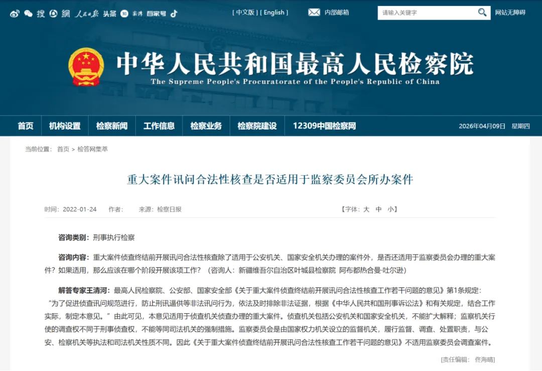 按照上述解答专家的逻辑,《办理刑事案件排除非法证据规程》第4条中列明的也是“侦查机关”,所以“重大案件讯问合法性核查”程序肯定也不适用于职务犯罪案件。