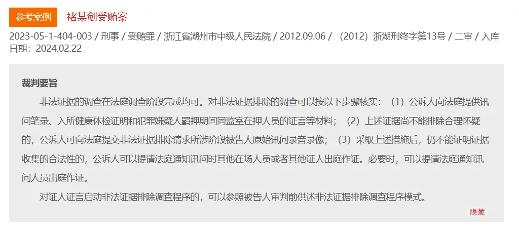 以上特点决定了职务犯罪案件的“排非”现状——被调查人很难提供“非法证据相关线索或材料”,“排非”成功可能性小之又小,所以我们通过公开途径能检索到的相关成功案例也少之又少。最高人民法院刑二庭编著的《职务犯罪审判指导》迄今为止已经出了4辑,其中刊载了56篇基于典型案例的法律适用分析文章,没有一篇论及过“排非”问题;人民法院案例库中收录的近200则案例中,仅有褚某剑受贿案一则的主题为“排非”相关——“法院如何审查受贿案件辩方提出的非法证据排除申请”,而且该案当事人最后也没有“排非”成功。