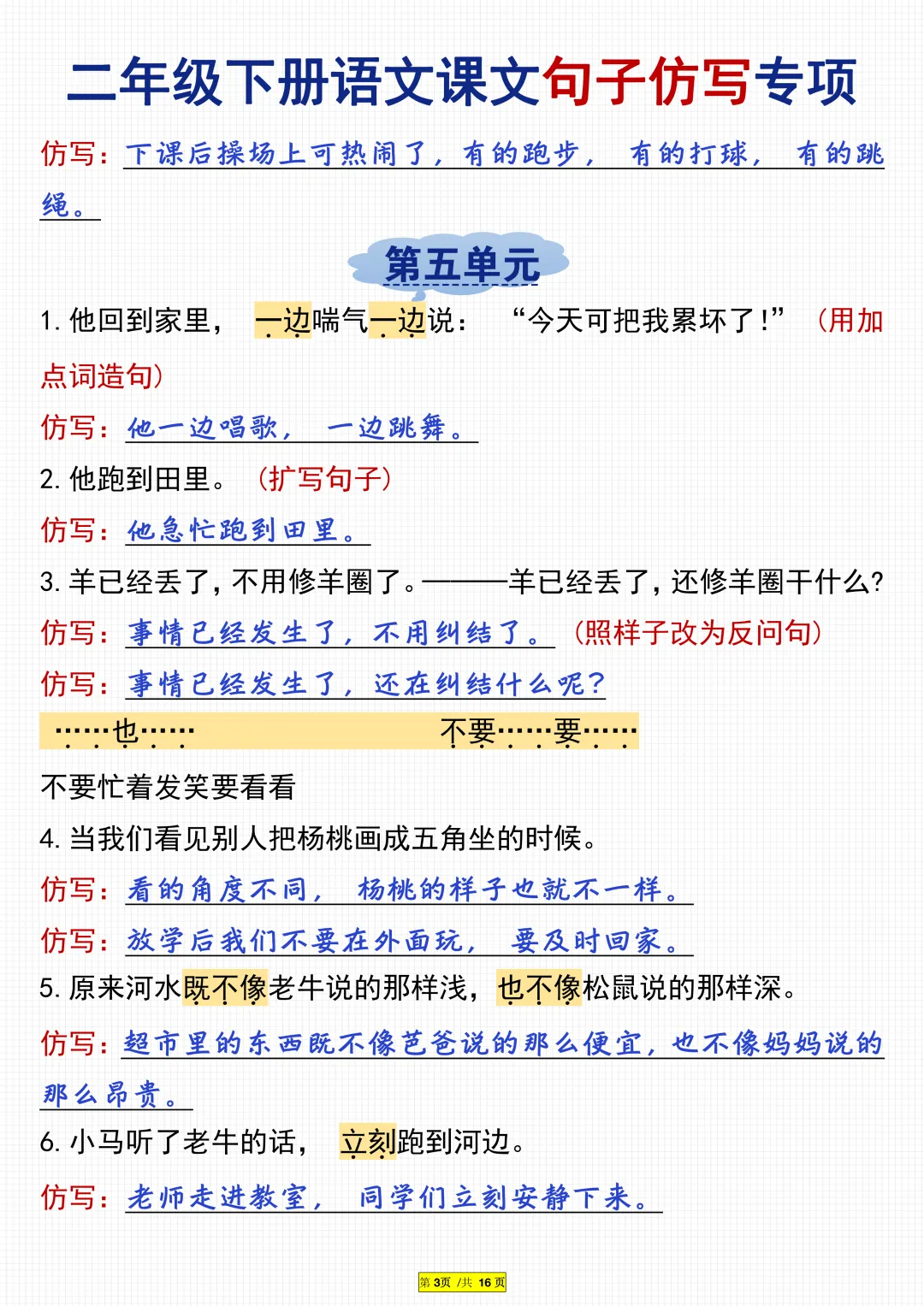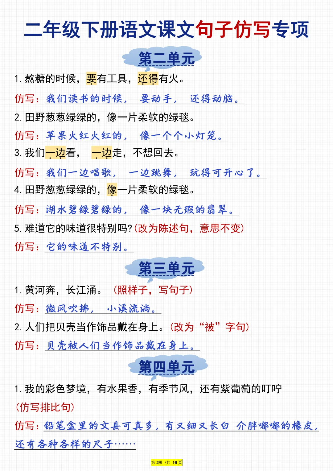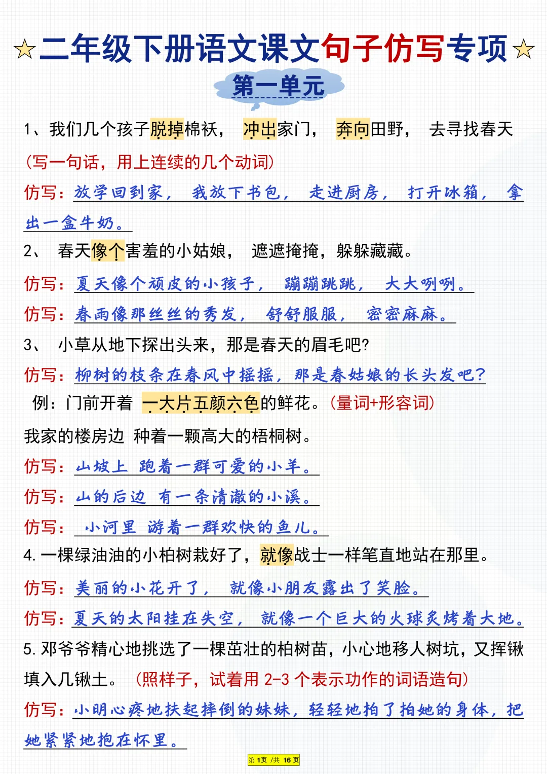 二年级下册语文:课文句子仿写专项,电子版可打印 家长们,↑关↑我领资料 今天老师分享《二年级下册语文:课文句子仿写专项》精选资料给家长,下载电子版打印给孩子记背练习! 提示:文末有完整电子版下载方式 (因篇幅有限,仅显示部分内容) 先加老师好友,方便接收完整资料 若已是好友(同头像),就不要重复加!(家长多,若没及时回复,请耐心等待) 每天150位+家长在领取!