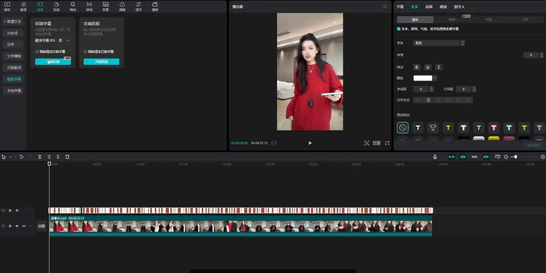 1、创建一个新的剪映草稿,把直播原视频导入,然后智能识别字幕。如果是常规做法,就是把无用的字幕删除,然后删除对应的视频片段,但我使用ai工具来实现这个操作。识别完字幕后,关闭这个剪映草稿。