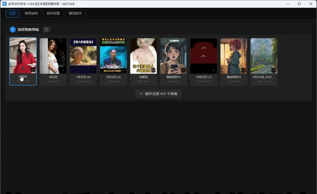 2、打开谷哥切片助手,切片助手会自动把剪映草稿列表读取出来,这时候选中你要处理的草稿。