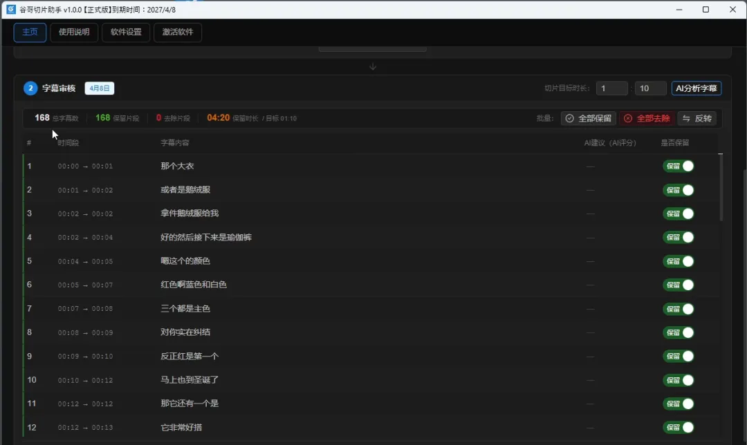 选中对应的草稿后,草稿中的字幕文本就会显示在字幕列表中,可以手动去操作字幕片段的去留,也可以直接点击“AI分析字幕”用ai模型去自动分析。当前这个ai模型支持gpt、claude、deepseek、kimi、智谱ai等常规的大模型。对于使用哪个模型或者如何找到对应的模型,我另外有篇说明:谷哥切片助手设置ai大模型的说明