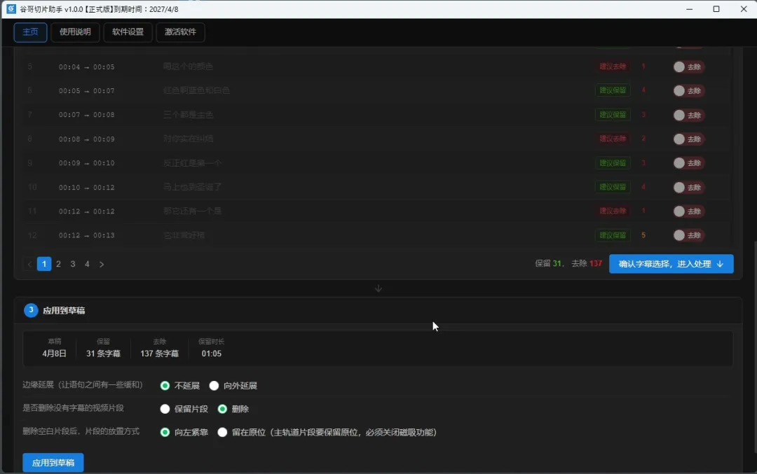 3、上一步使用ai分析字幕后,查看一下是否需要调整,或者对于结果的时长,是选择按照ai建议,还是按照设置的目标时长进行筛选,可以根据自己的需求进行选择。确认字幕的去留后,可以点击确认按照,接着下一步就可以直接应用到剪映草稿中去,软件界面清晰明了。