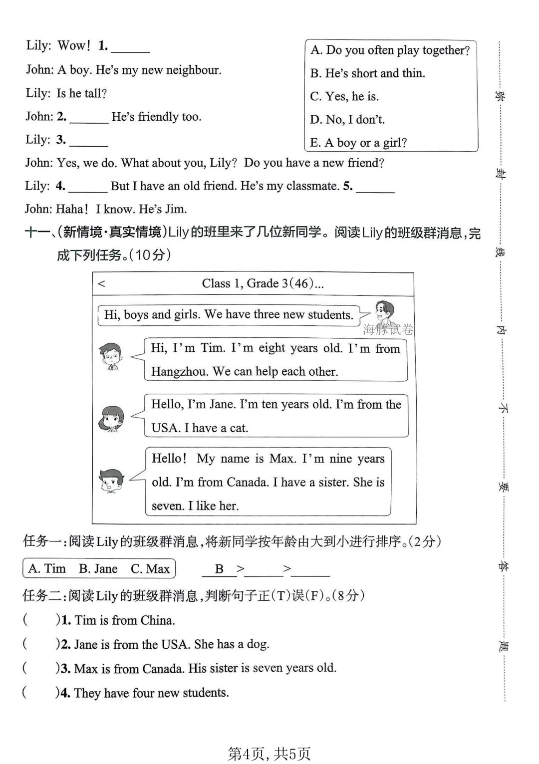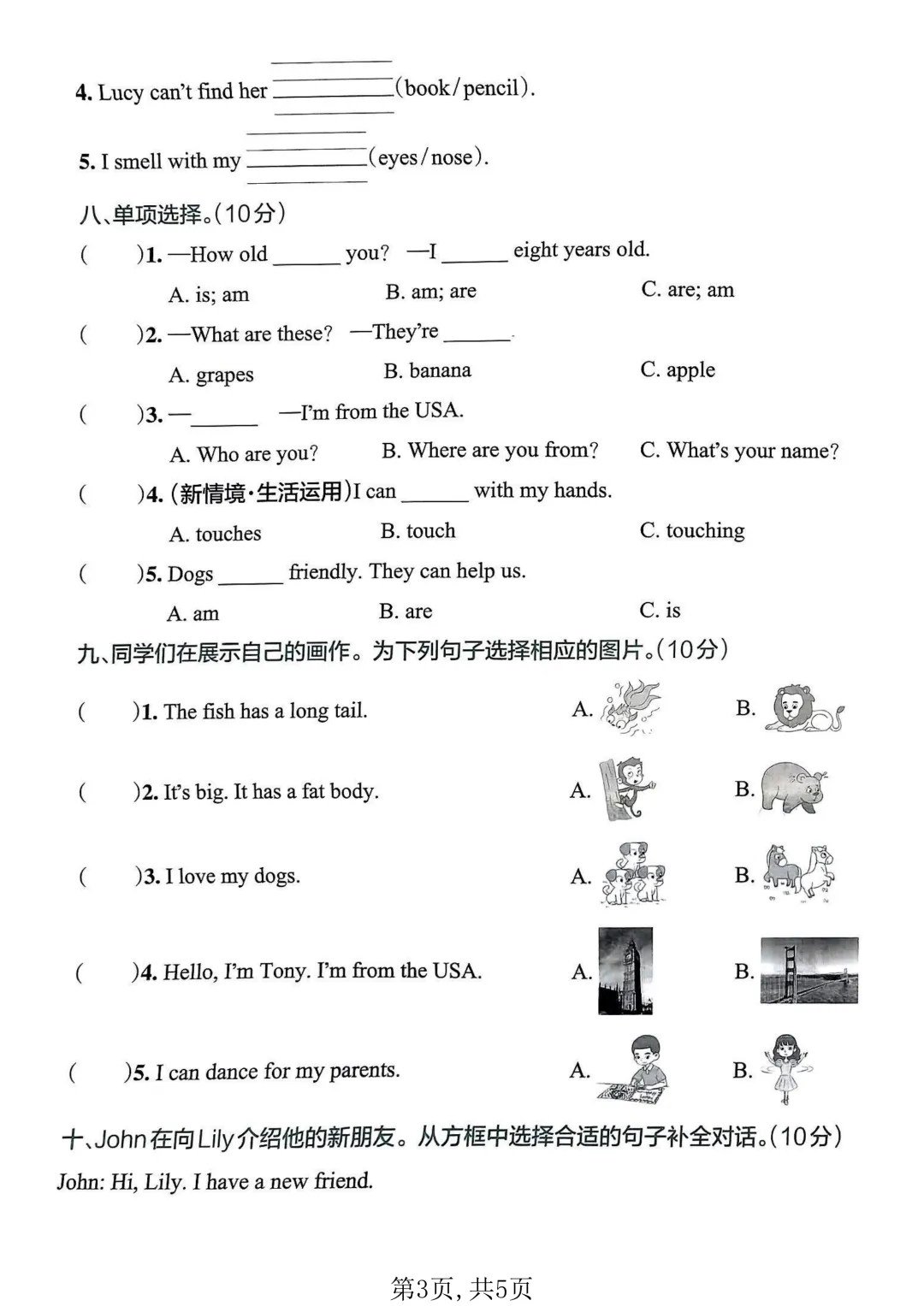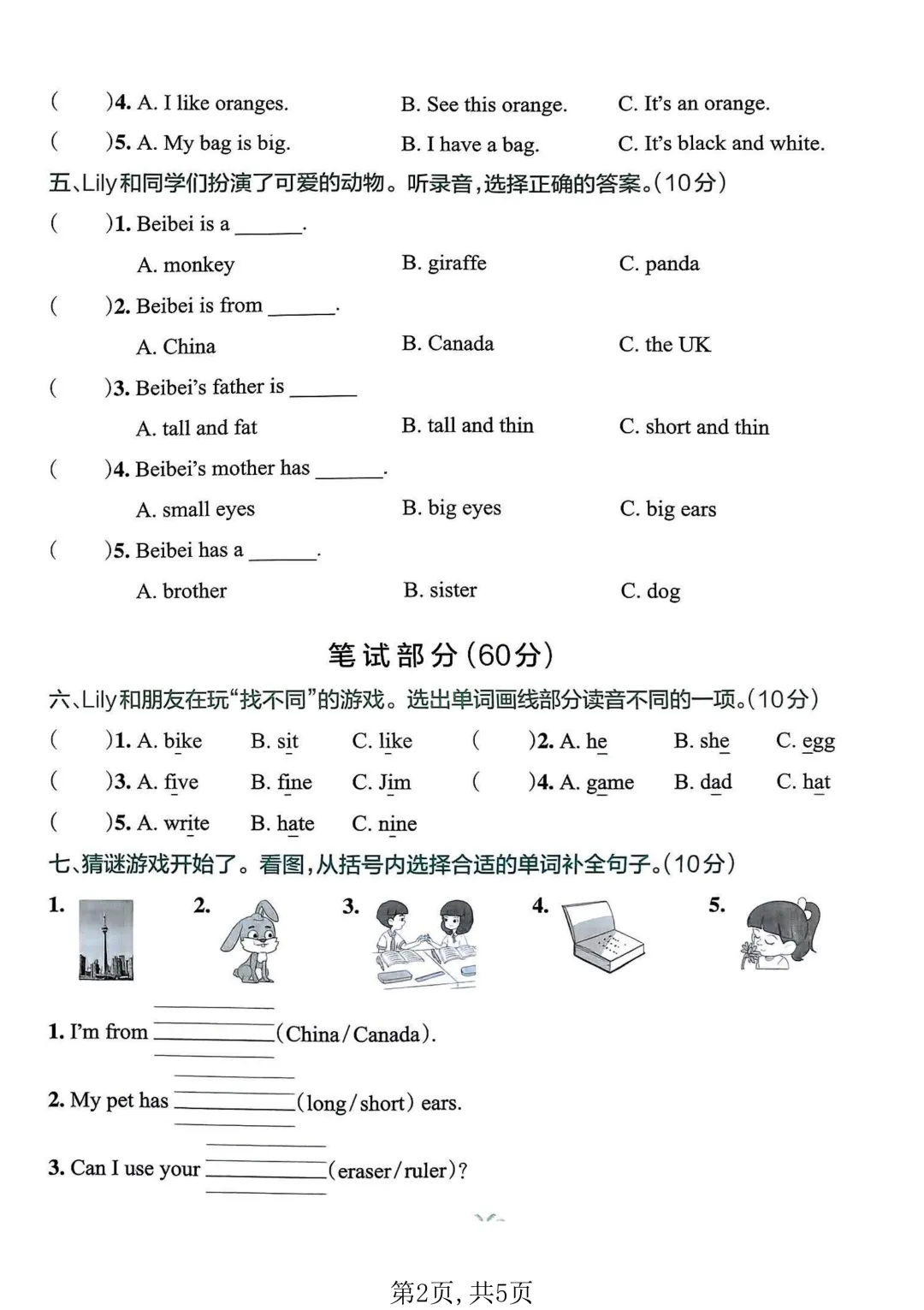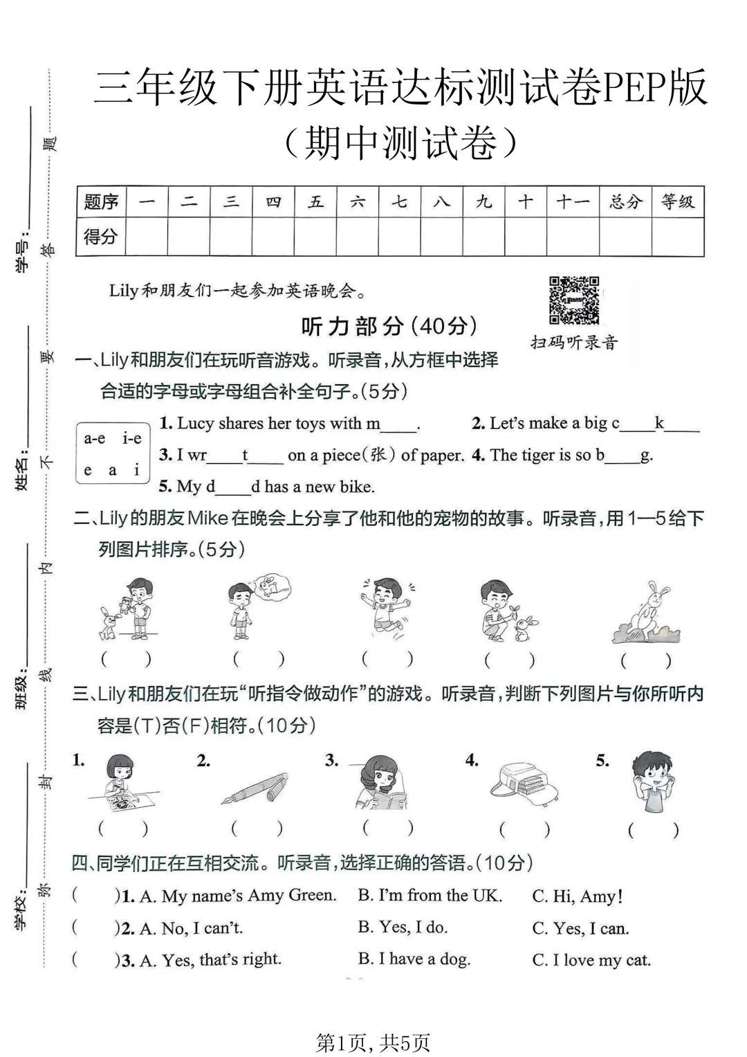 26人教版三年级下册英语期中达标测试卷,共4页,电子版可打印,这份人教版三年级下册英语期中达标测试卷,内容覆盖听力、笔试全题型,难度贴合期中考点,孩子可以用来考前自测、查缺补漏,家长也能精准掌握孩子的学习情况,轻松应对期中考试。有需要的家长赶紧打印出来,给孩子练习吧!
