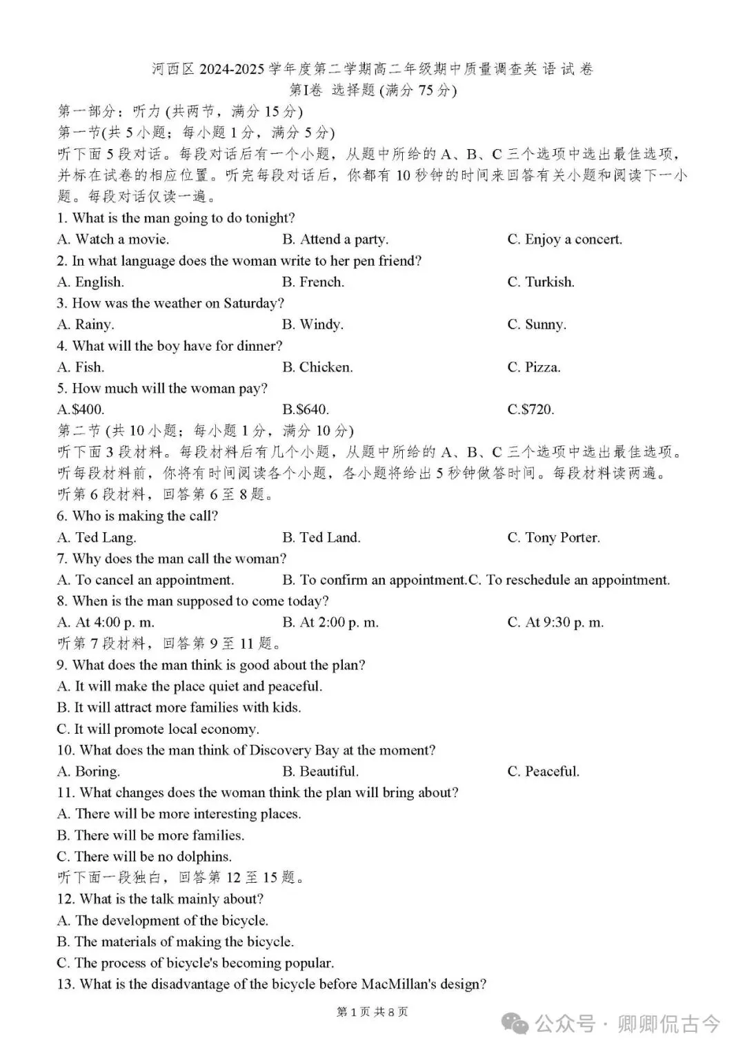 【可下载】2024-2025年下学期河西区高二期中英语试卷 点击上方“蓝字”免费关注! 本套试卷+答案解析下载入口 关注“卿卿侃古今”公众号 在聊天对话框内发送关键词 4251 相关链接: 2007-2025年天津市高考英语真题汇总(持续更新中~) 2011-2023年天津高考英语听力真题在线测试 【考前热身】天津高考英语听力真题 【高考英语听力在线测试】高考听力机考模拟试题大全(持续更新中) 【可下载】2025-2026年高中英语试题汇总(附解析)【持续更新中】 【汇总】高中英语月考和期中期末试题(持续更新中~) 【题库】高一英语试题汇编(持续更新中~) 【题库】高二英语试题汇编(持续更新中~) 【题库】高三英语试题汇编(持续更新中~) 【可下载】高三英语上学期期末试题16套(附解析) 【可下载】高二英语上学期期末试题10套(附解析) 【可下载】高一英语上学期期末试题汇9套(附解析) 【可下载】2025-2026学年度高一高二高三开学考试模拟试卷(天津专用)(附解析) 新外研版高中英语高清电子课本、课文原文和译文、单元同步复习资料和试题【持续更新中】 【目录1】高中英语阅读理解限时训练大全(持续更新中~) 【目录2】高中英语完形填空限时训练大全(持续更新中~) 【目录3】高中英语书面表达大全(持续更新中~) 【目录4】高中英语听力训练大全(持续更新中~) 【目录5】高中英语单选题大全(持续更新中~) 【目录6】高中英语语法题大全(持续更新中~) 【目录7】高中英语阅读表达题大全(持续更新中~) 【目录8】科普知识汇总 【目录9】中高考学法知识汇总 【目录10】高考英语真题+名校模拟真题+月考和期中期末试题(持续更新中~) 【目录11】暑期高考英语备考资料大全持续更新中~【汇总】中高考志愿填报资料大全 【汇总】高中英语月考和期中期末试题(持续更新中~) 【汇总】2025届高三英语一模试题(附解析) 【汇总】2024届高三英语一模二模三模试题(附解析) 【汇总】2024届高考英语押题卷(附解析) 【汇总】2025届高三英语周考综合练(附解析) 【题库】高三英语限时训练(持续更新中~) 【模拟】2025届高三英语听力机考模拟试题在线测试 【高考词汇】(新)外研版高中英语全七册词汇表(附音频) 【中考词汇】初中英语外研版必备单词表(完整版),可打印 建议收藏保存 点击阅读原文查更多