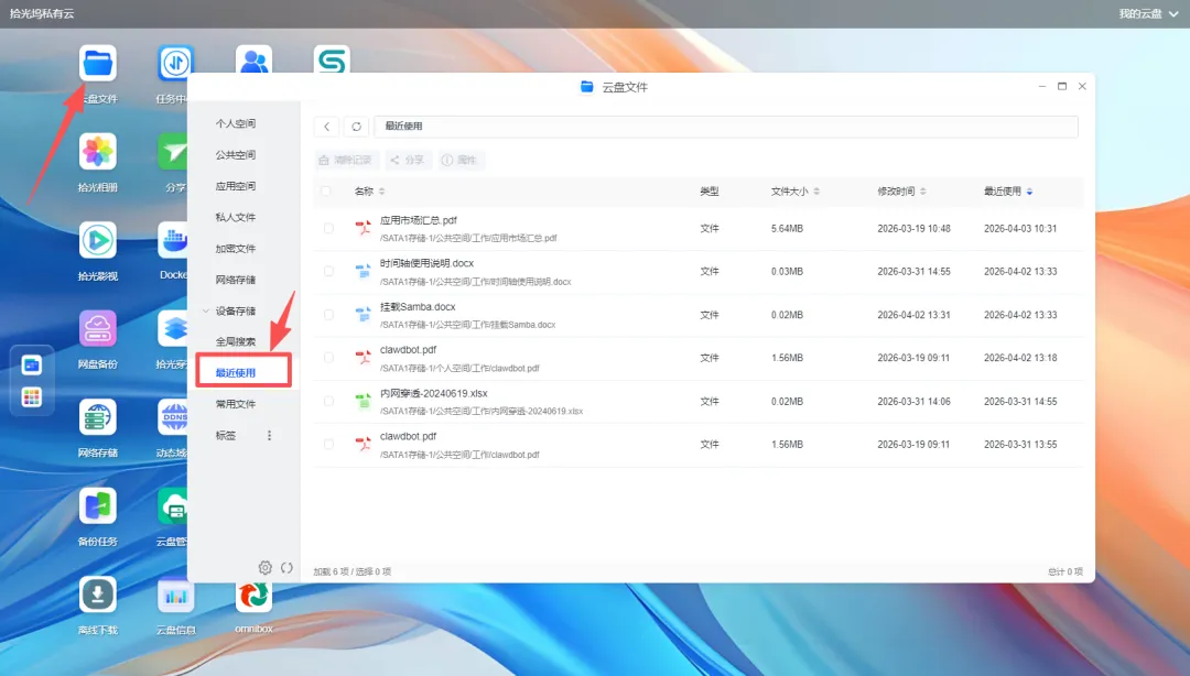 所有功能都已全量上线,只需打开拾光坞电脑端进入【云盘文件】栏目、手机端进入【文档管理】栏目,即可点击「最近使用」「常用文件」「标签文件」三大模块,解锁高效文件管理新体验。
