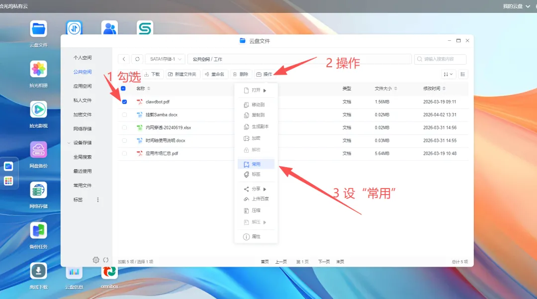 打开【云盘文件】,勾选所需文件,点击【操作】,设为【常用】,文件和文件夹均支持设为常用文件。