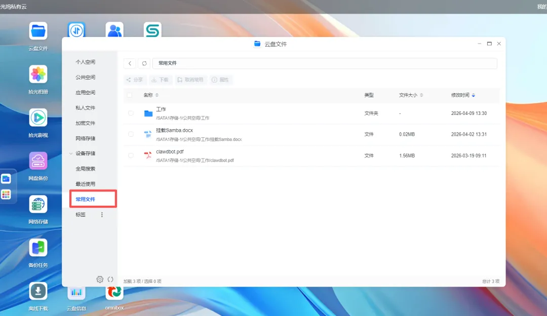 你只需给常用的文件、文件夹设置【常用】标签,它们就会统一收纳到这个模块里。不管是日常要更新的项目报表、每天都要看的学习资料,还是常打开的家庭照片等,都能一键标星收藏,打开就能直接查看。