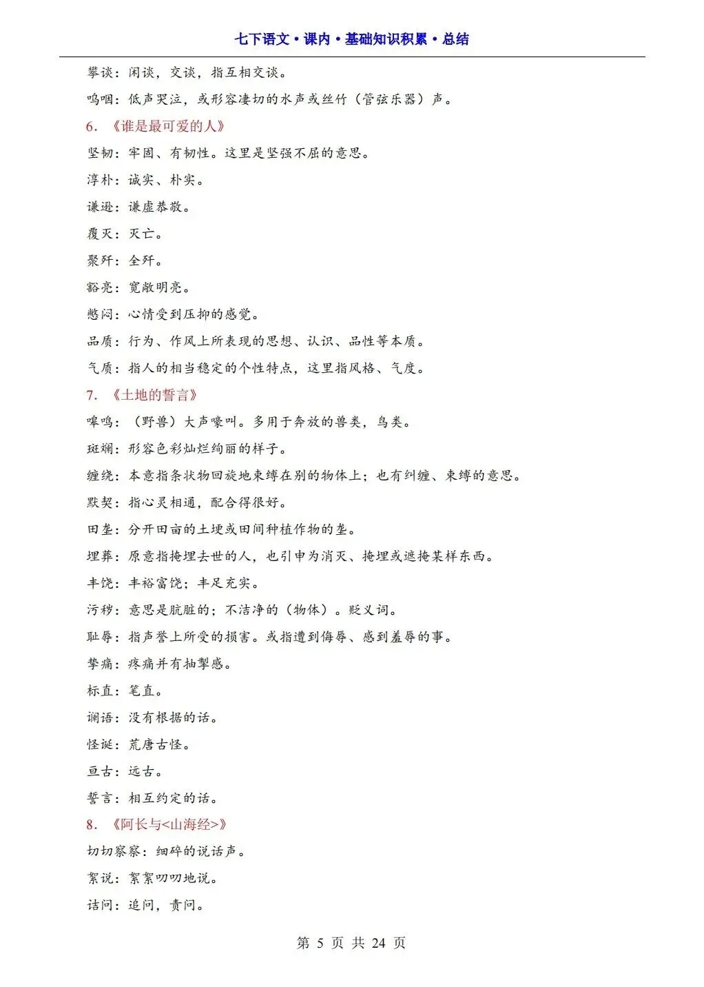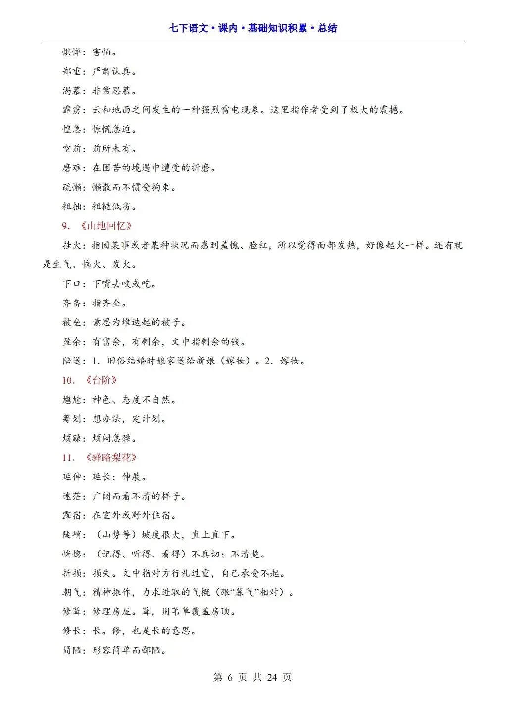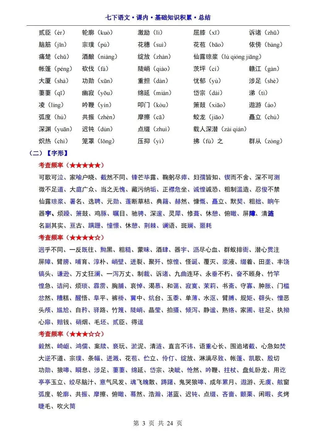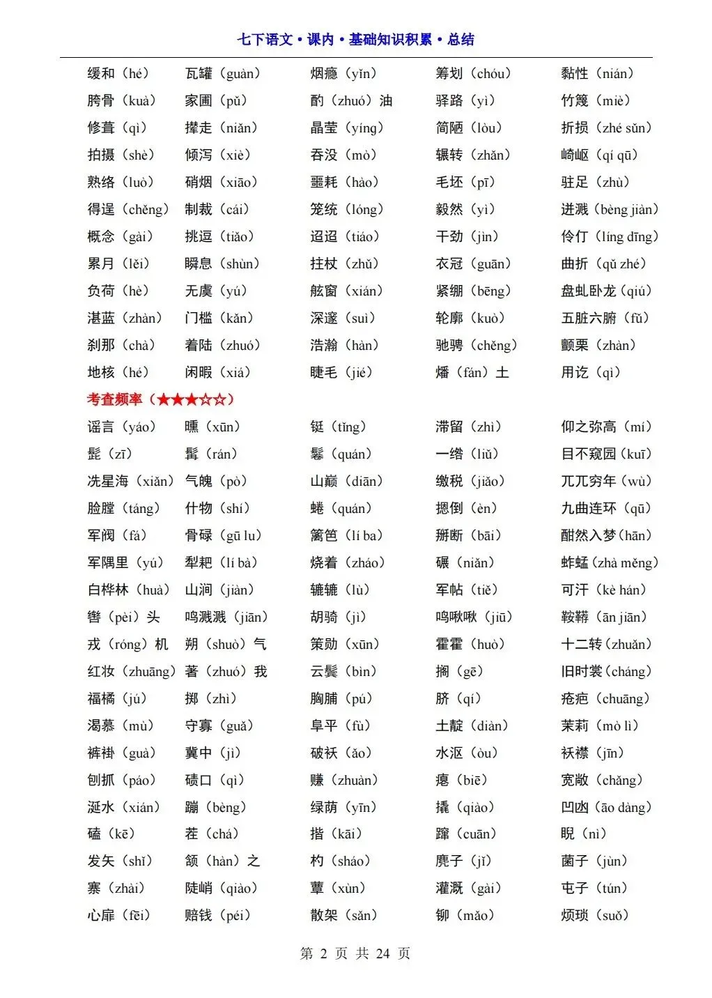 2026版七年级下册语文课内基础知识积累总结,可打印电子版!