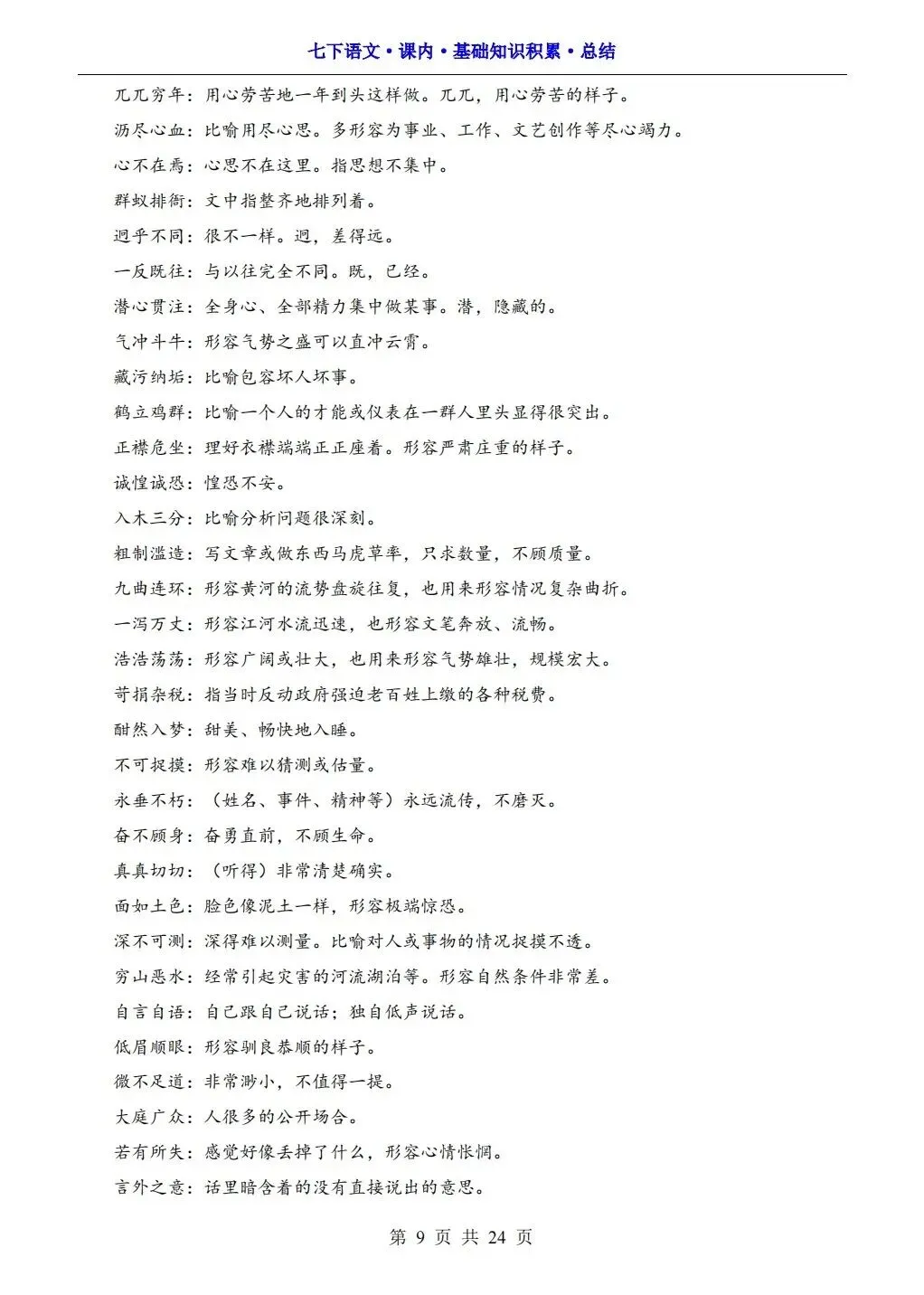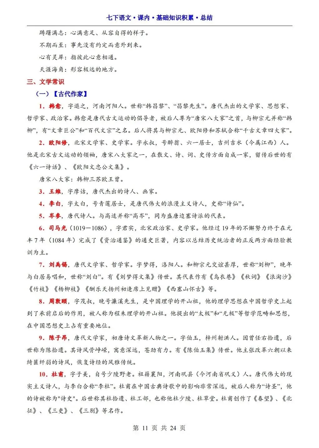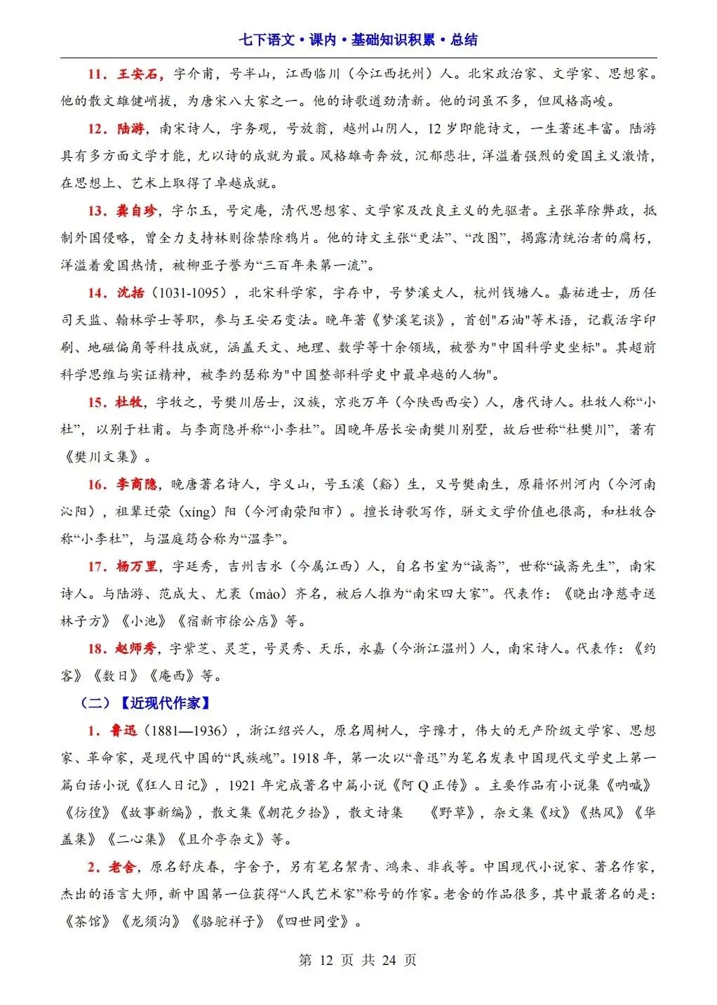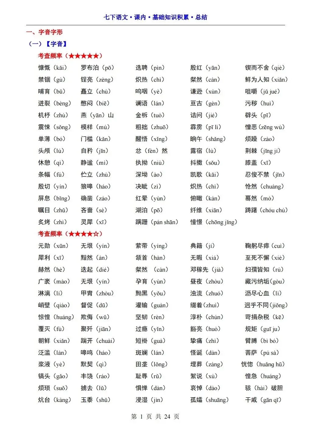 2026版七年级下册语文课内基础知识积累总结,可打印电子版!