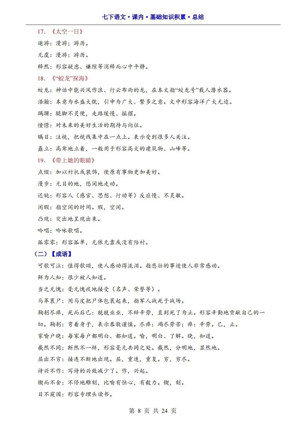 大家好,今天老师整理了:2026版七年级下册语文课内基础知识积累总结,可打印电子版!