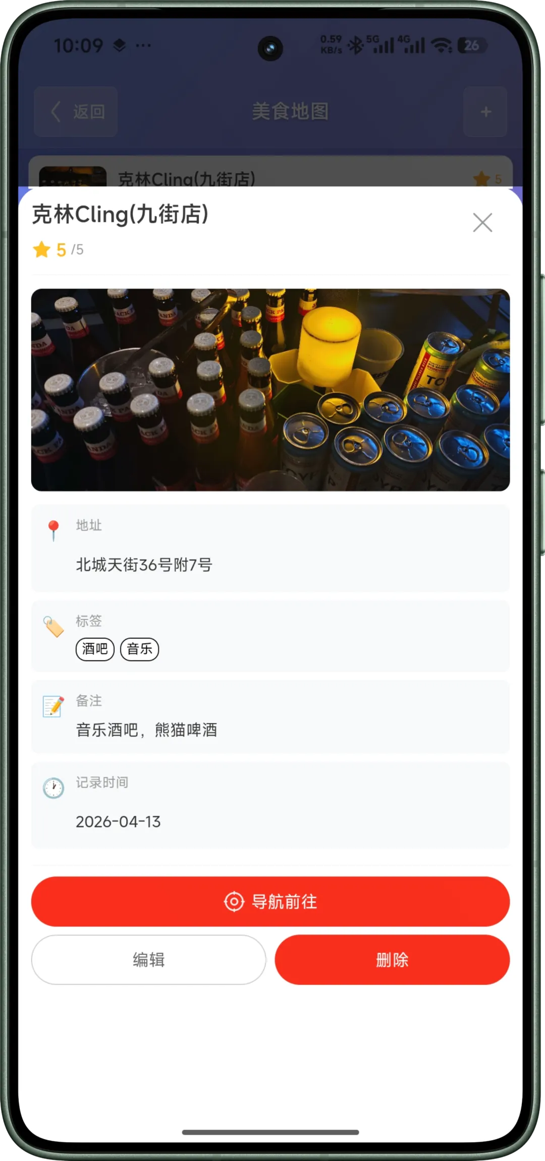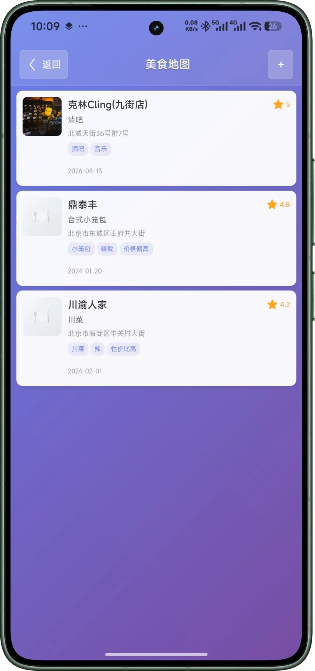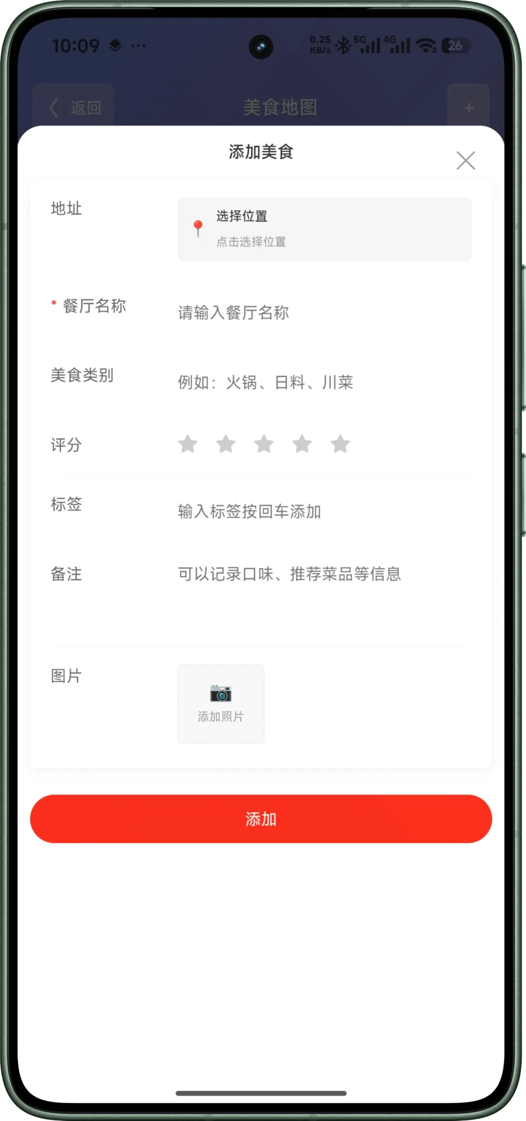 – 添加美食地点(名称、地址、类别、评分、标签、备注)