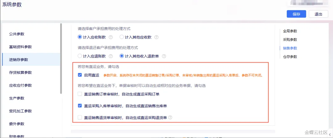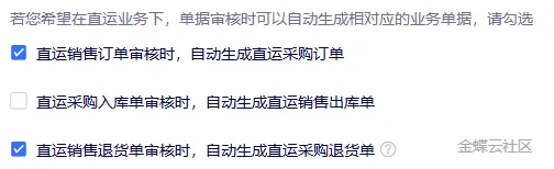 2、在直运销售流程中,如需实现以下三种场景的自动生成单据——直运销售订单生成直运采购订单、直运采购入库单生成直运销售出库单、直运销售退货单生成直运采购退货单。可通过系统参数勾选相应选项,系统将生成“保存”状态的目标单据。