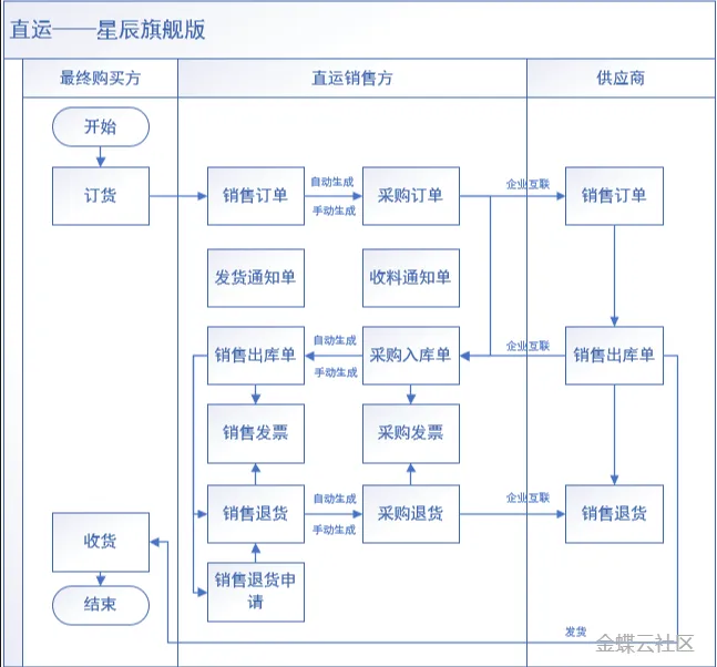 在单据流程中,直运销售订单可下推生成直运采购订单,直运采购入库单可下推生成直运销售出库单,直运销售退货单可下推生成直运采购退货单,并支持全流程跟踪。