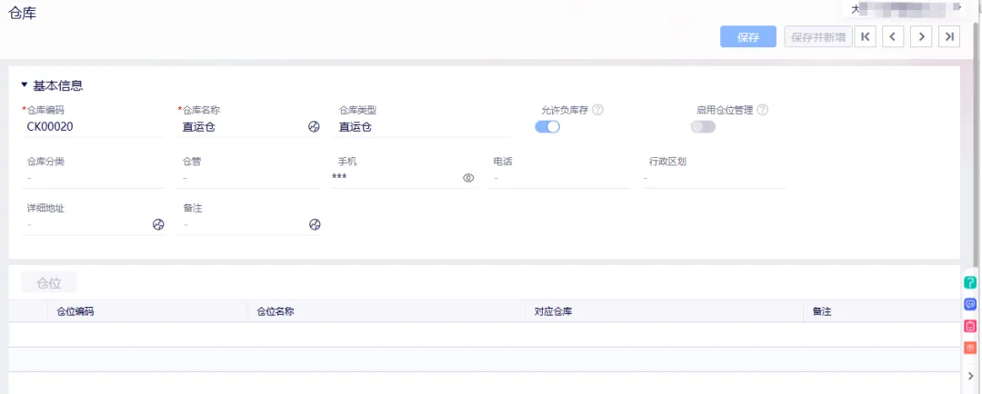 勾选“启用直运”参数后,系统将在【基础资料>仓库】中自动新增“直运仓”,该仓库资料不可编辑,目前仅支持唯一的直运仓且不允许新增,以便开单时按业务模式快速携带仓库。