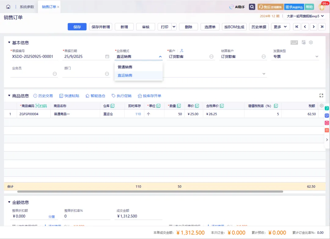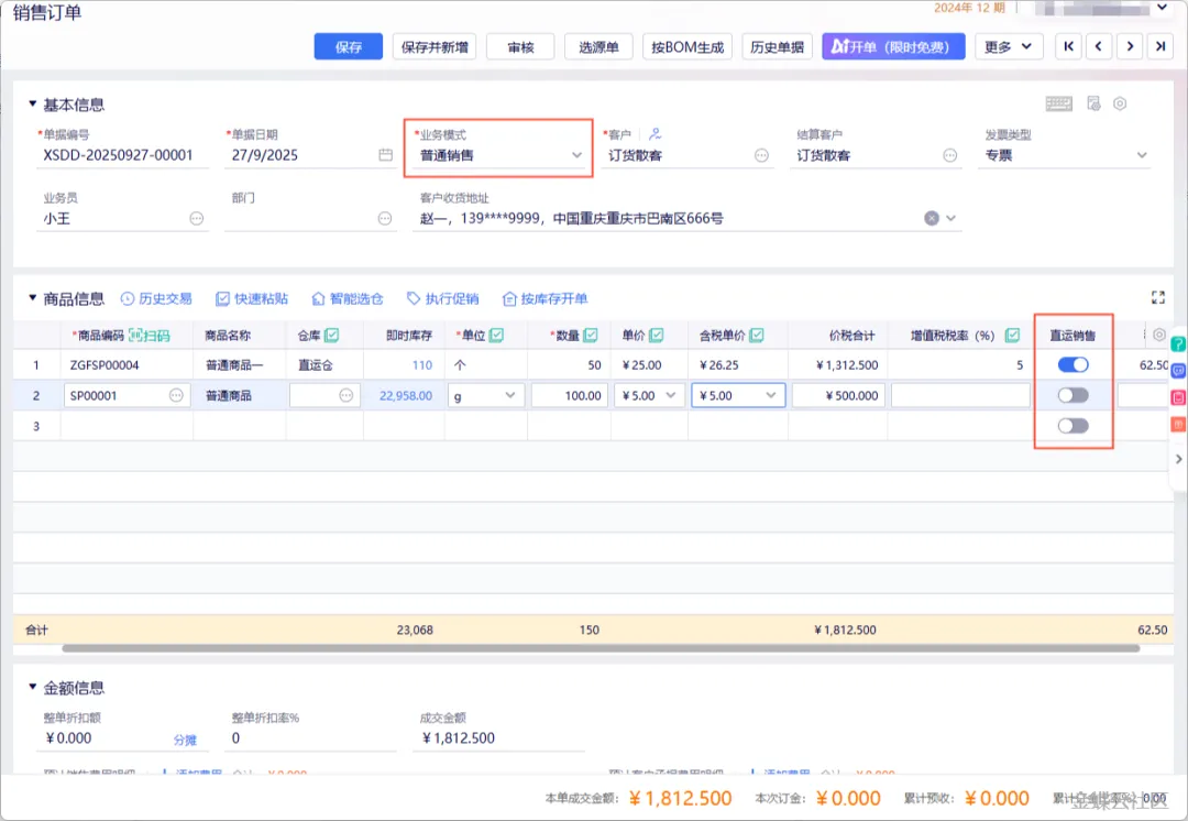 若为普通销售,系统支持混合模式:可在商品行中设置是否“直运销售”,系统将按行区分直运与非直运商品,并执行相应的流程控制。