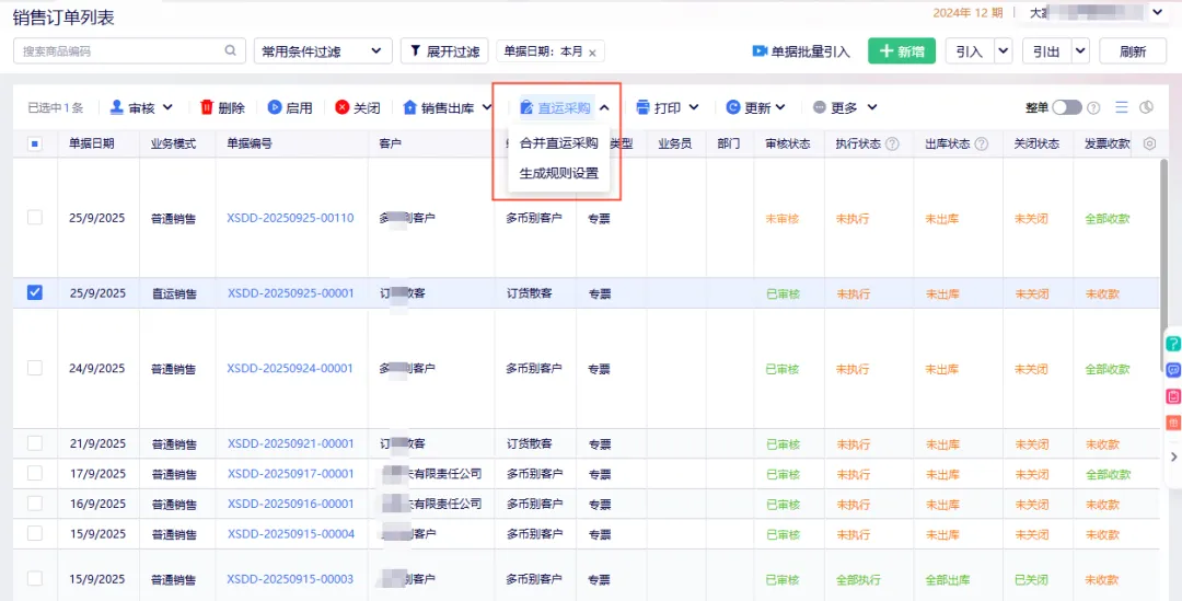 (2)在销售订单详情或列表中,提供“直运采购”功能按钮。