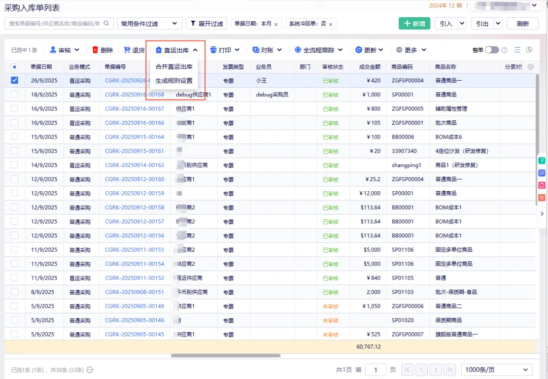 在采购入库单单据详情或单据列表中,提供了“直运出库”功能按钮,单据列表支持一对一下推和合并下推,下推时支持设置生成规则,用于设置采购订单携带的字段:单据日期、单据备注、业务员、部门、商品行备注。对于商品、客户、客户收货地址则是默认携带到销售出库单。