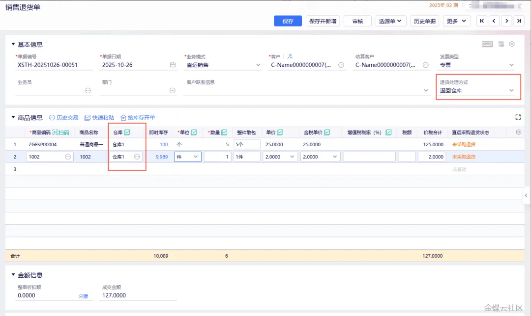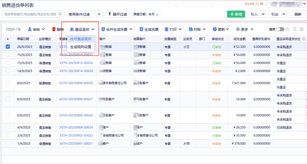 (2)销售出库单生成销售退货单:直运销售业务模式与普通销售模式逻辑一致,允许部分退货。