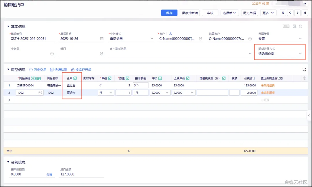 (1)新增销售退货单:允许手工新增直运销售退货单,以便选源单时通过业务模式过滤出直运销售出库单,若为直运销售模式,商品行为直运仓,不可修改,表体的供应商在单据审核时要求必录。