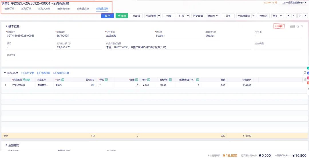 以上提及的单据及流程,都可以在单据的“全流程跟踪”展示直运销售有关联的单据。