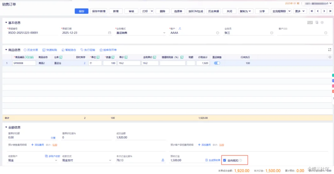 销售订单预收订金,勾选定向抵扣,下游直运采购入库单生成直运销售出库单时,销售出库单自动抵扣源销售订单中的订金。