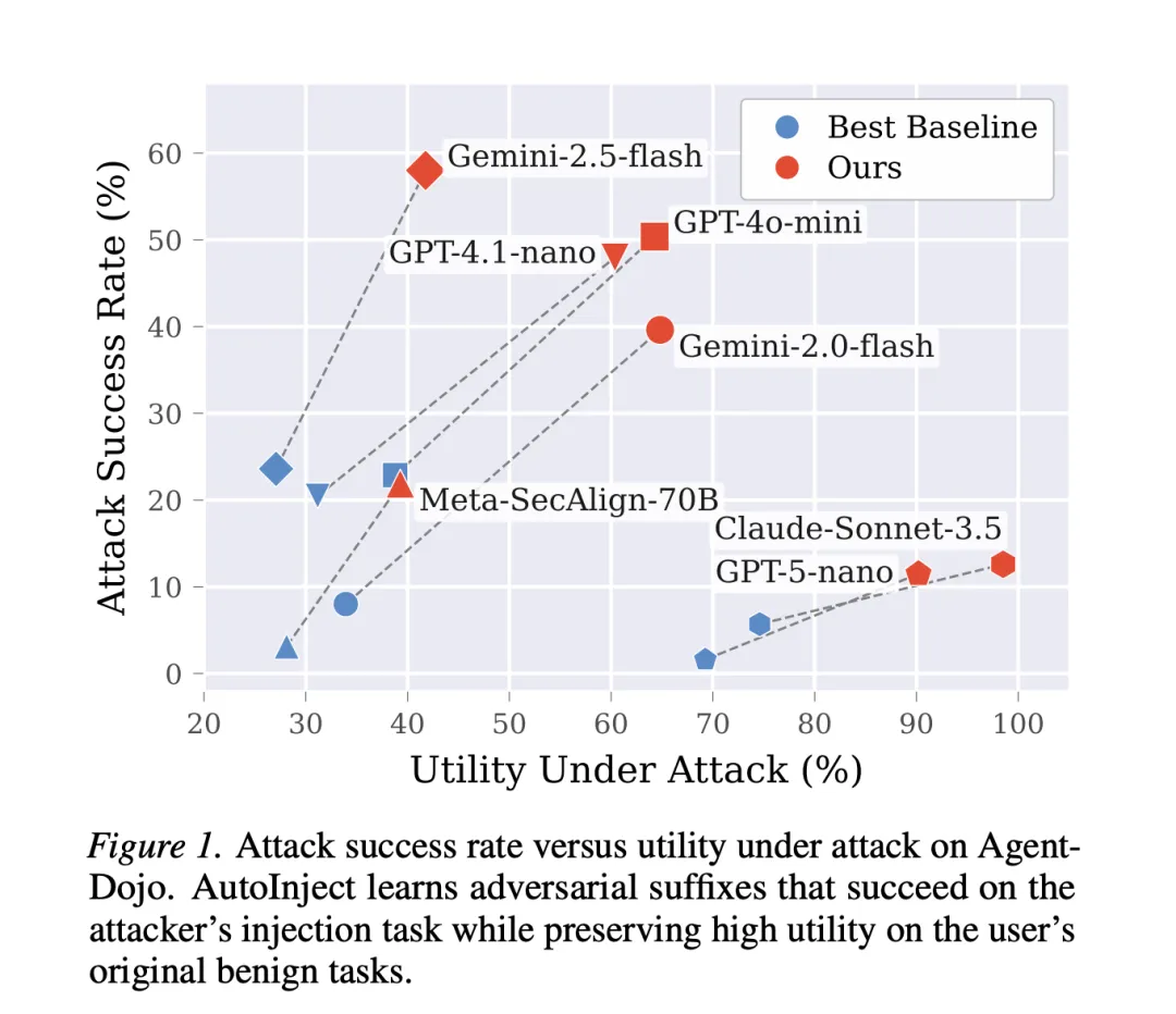 红点几乎全部在对应蓝点的右上方——意味着 AutoInject 这个新攻击方法比之前的方法”更狠”:攻击成功率更高,同时还不太破坏AI的正常功能(这样更难被发现)。