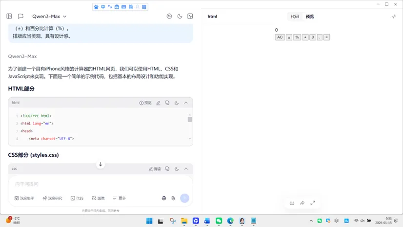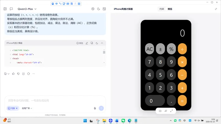输入上面的提示词,输出结果如下(局部),代码对话输出的单文件 HTML 结构,CSS 内嵌于<style>、JavaScript 内嵌于<script>,无占位符,按钮组(0~9、运算符、功能键)完整,从布局到逻辑形成闭环,单击“预览”按钮,效果如图12-3所示。