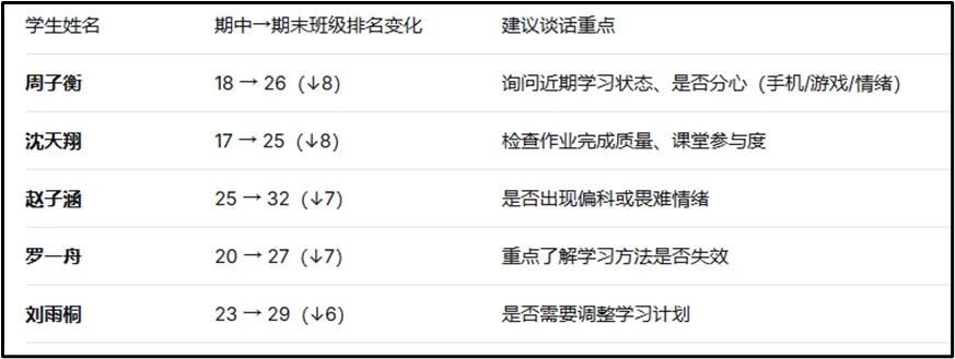 我把全班的期中、期末成绩表喂给DeepSeek,3分钟后,它直接告诉我: