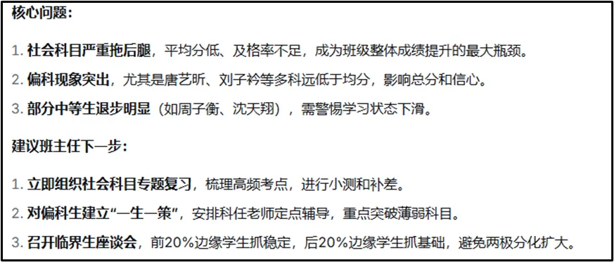 5. 最后用3-5句话总结:本次考试班级的核心问题是什么?建议班主任下一步做什么?