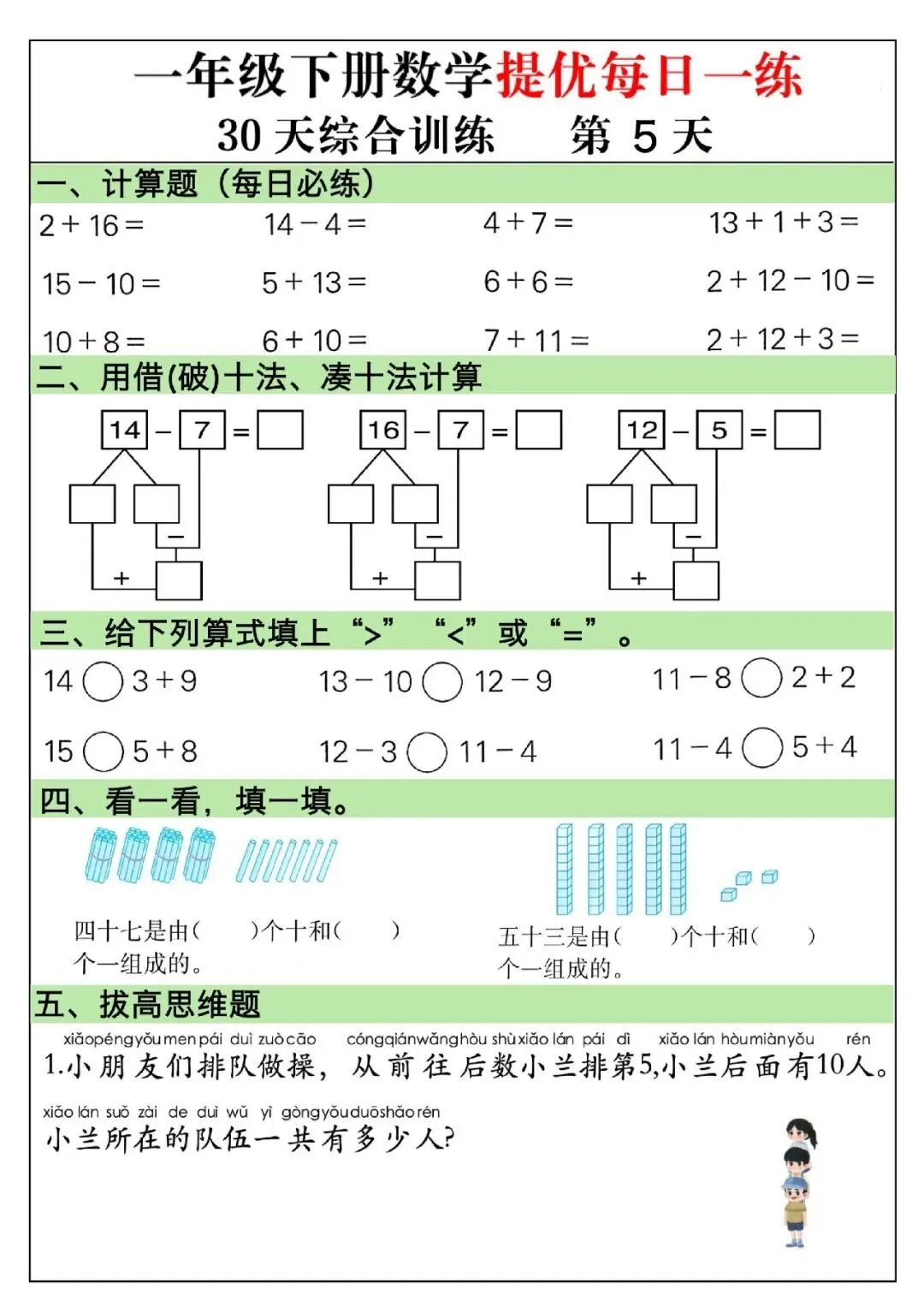 一年级下册数学题可打印(计算题+应用题+思维题+看图列式+填空题+找规律)每日一练