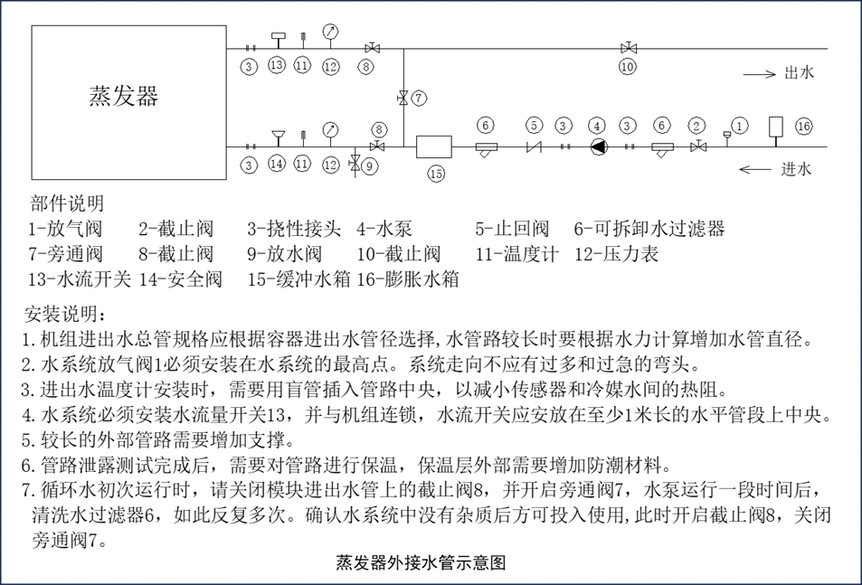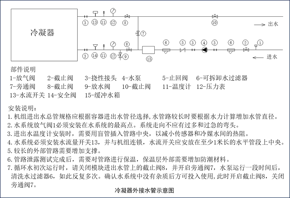 机组水系统的正确设计及安装对机组的稳定、高效的运行十分关键,因此需要对机组水系统进行精心的设计和严格检验。机组进出口必须安装截止阀以便于水系统能进行常规的维护。建议在容器进出口处安装温度计和压力表,便于日常的检查和后续的维护;水泵和机组进水处应安装水过滤器,避免杂质进入水泵和容器中;在水管未保温和机组未进水前应预先检查管路密封;与机组相连接的所有管路应安装减振装置;必须安装符合要求的流量控制装置;空调工程水系统安装排污时,应避开机组容器的进出水管路,否则将影响机组的正常使用。