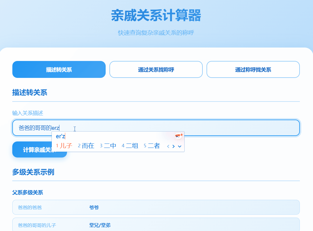 一款智能的亲戚关系计算器,帮助用户理清复杂的亲戚关系,快速计算出正确的称呼。