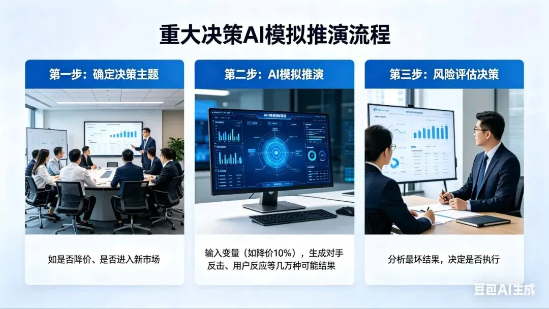 让团队用AI模拟一下。比如降价10%,对手会怎么反击?用户会怎么想?AI能给你跑出几万种可能的结果。