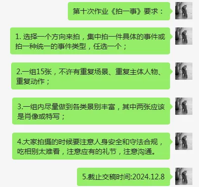关于拍事件的话题,前面第二阶段作业期间我已经反复讲解,不再啰嗦。需要特别说明的是:这次作业的“拍一事”,分两块内容,“拍一件事”或“拍一类事”,大家可以自选一项完成。