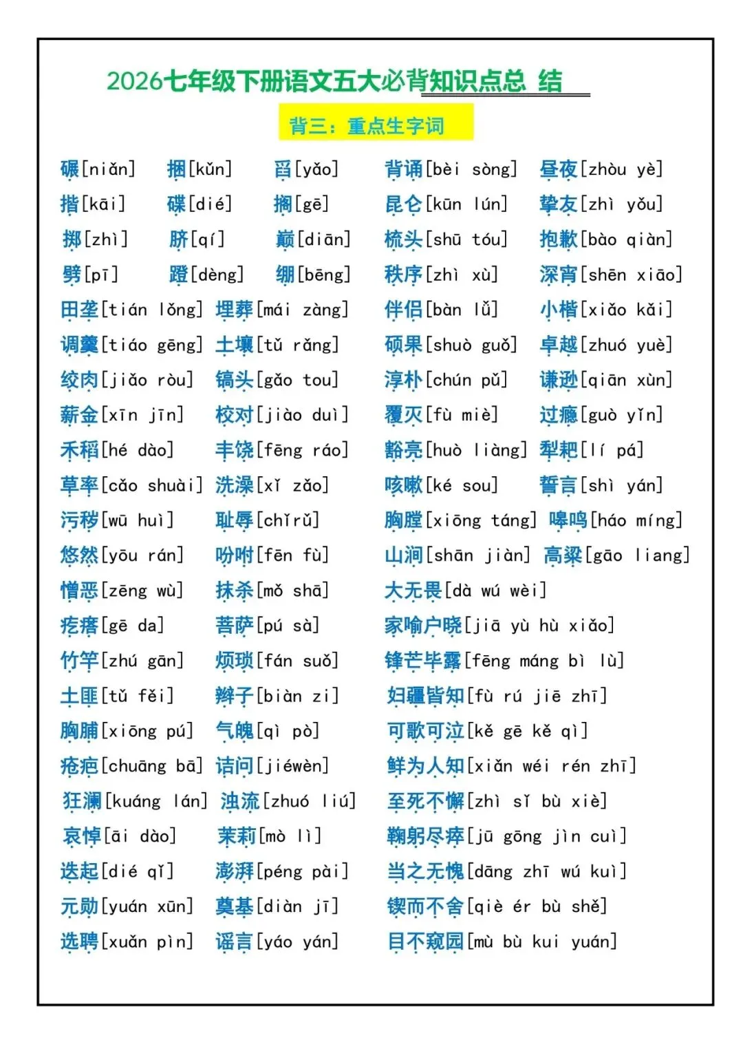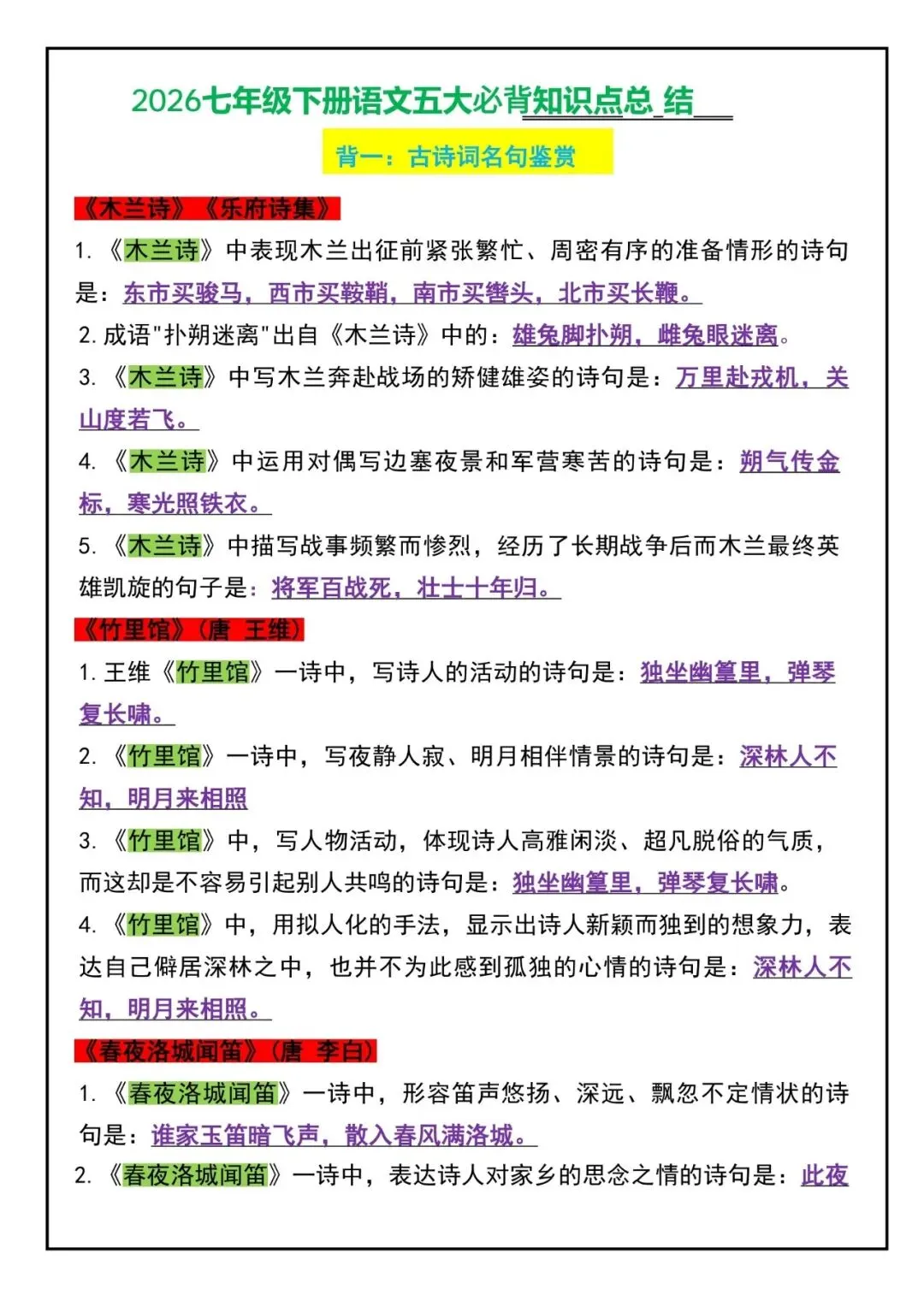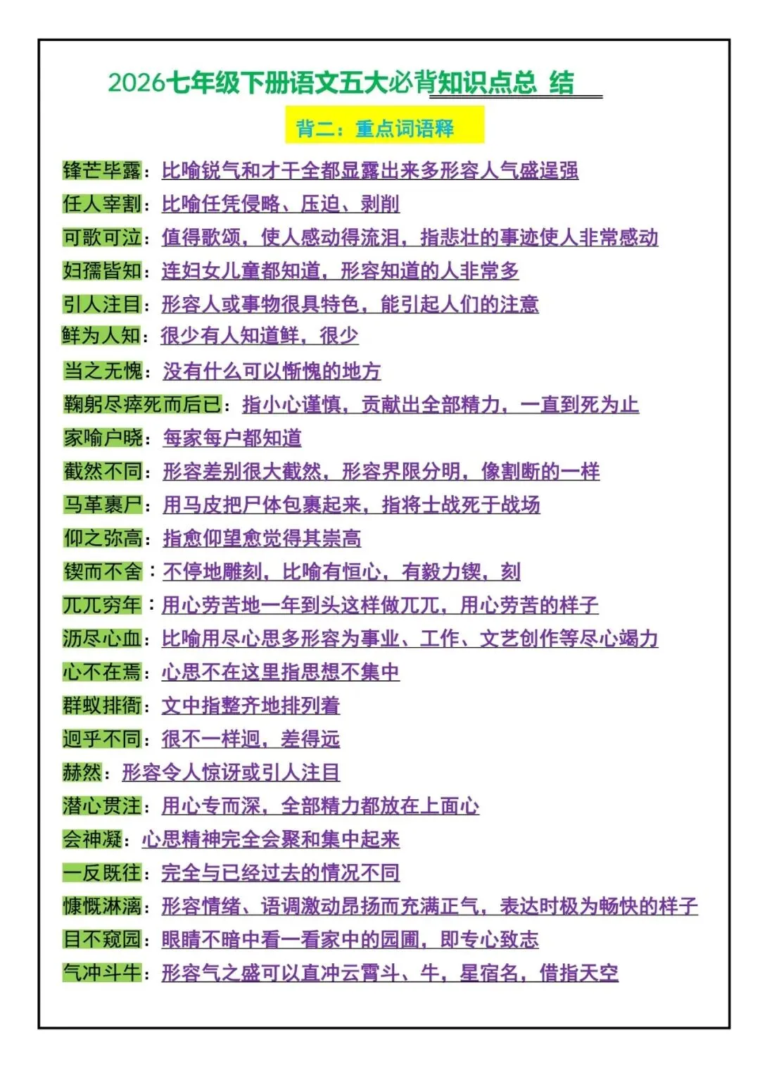 26新七年级下册语文五大必背知识点总结(电子版可打印)