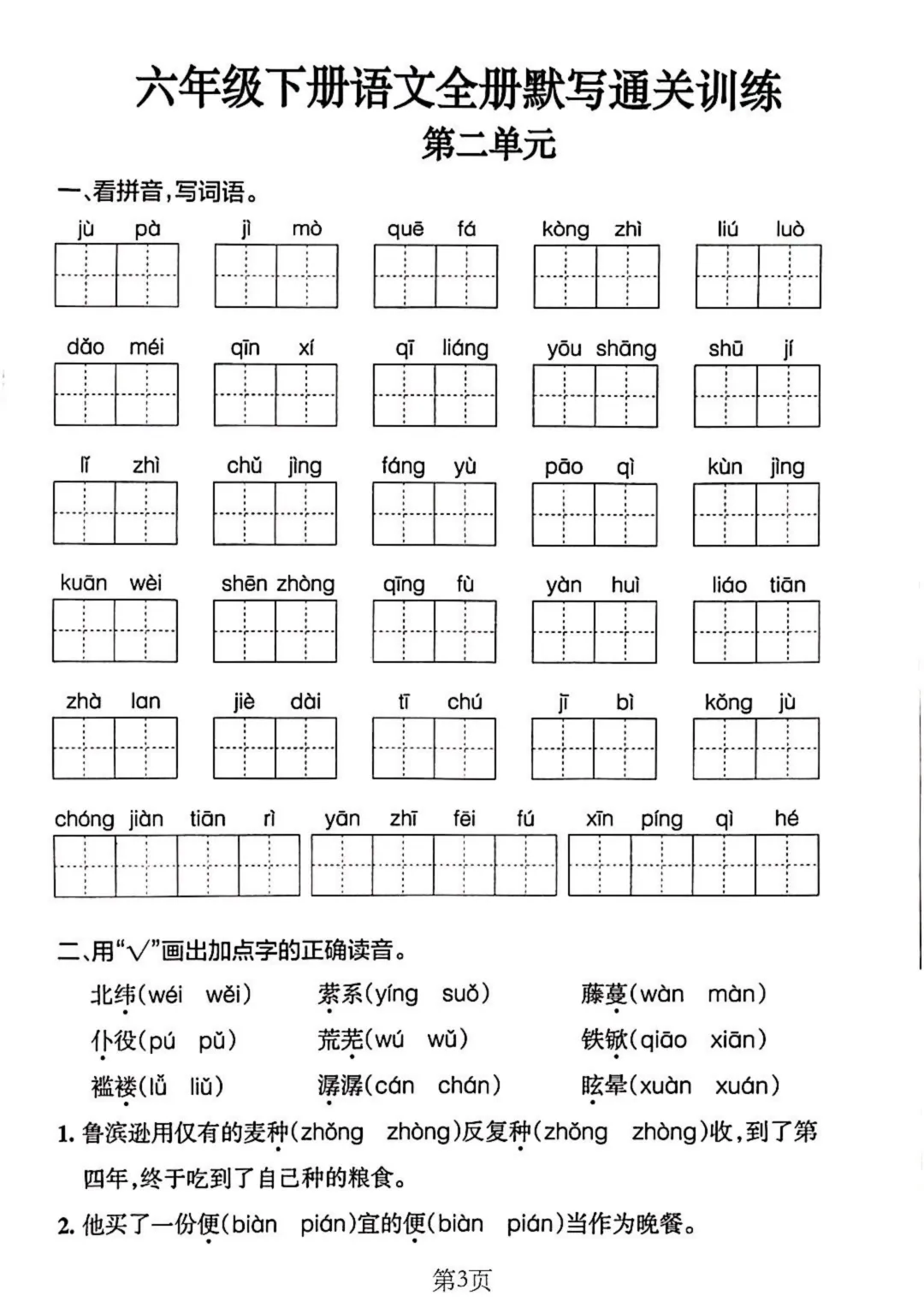六年级下册语文单元默写通关练习(电子版可打印)