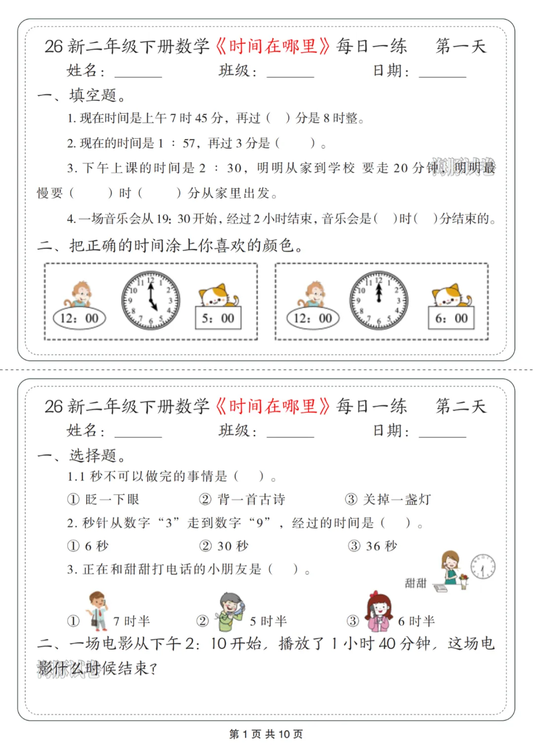 二年级(下)数学《时间在哪里》每日一练 电子版可打印