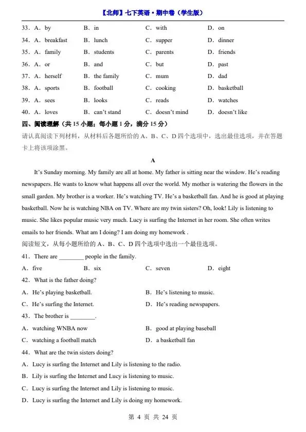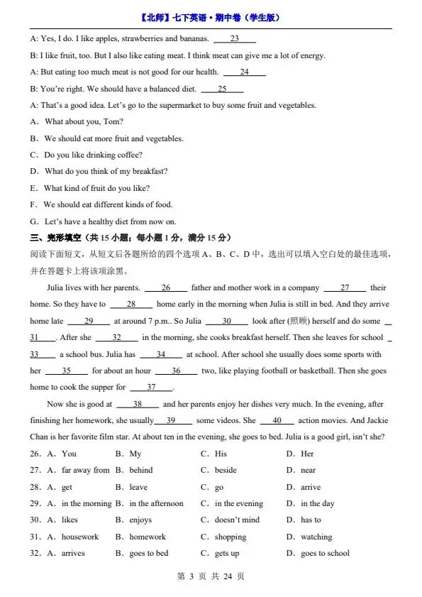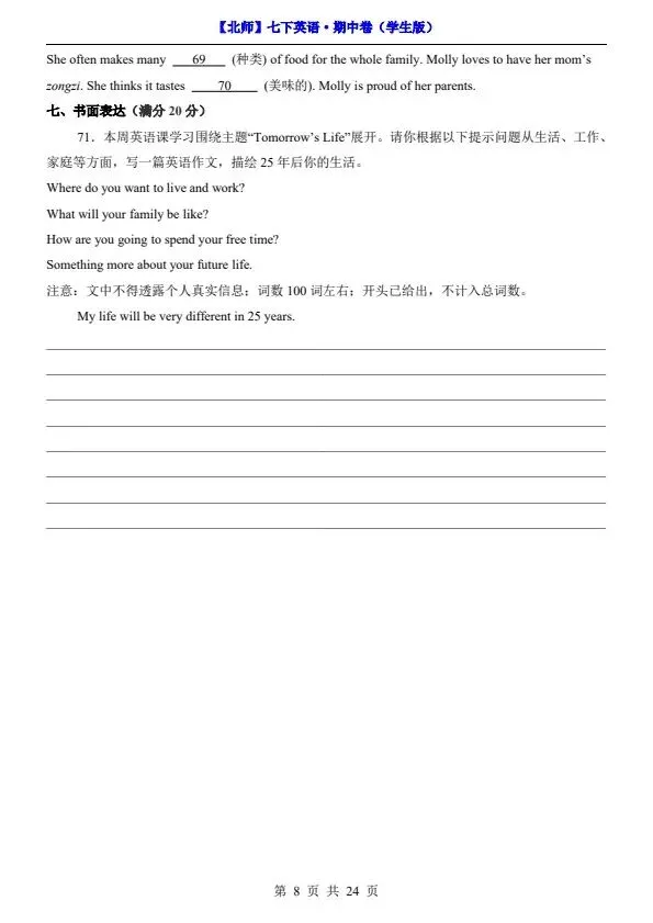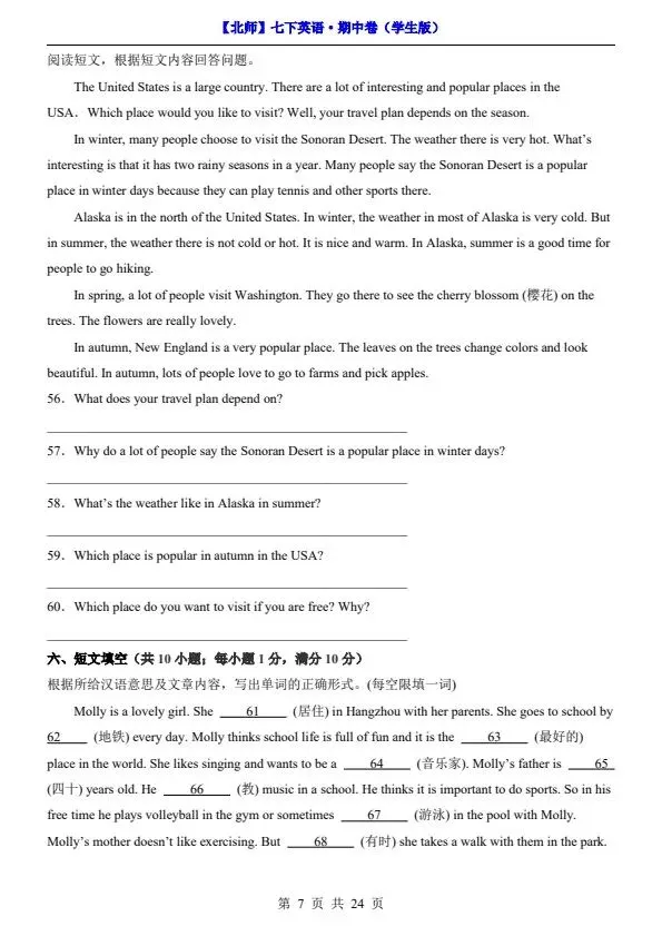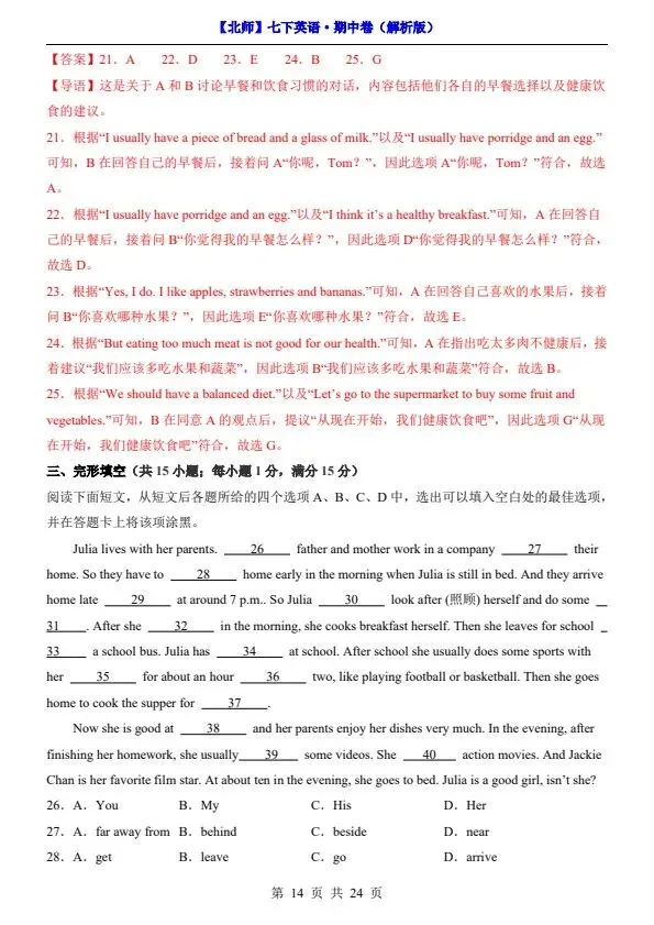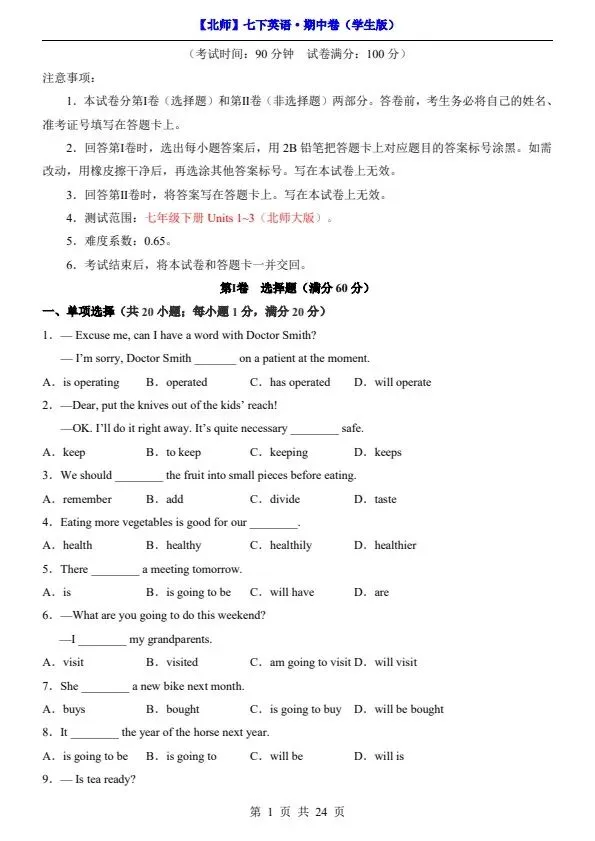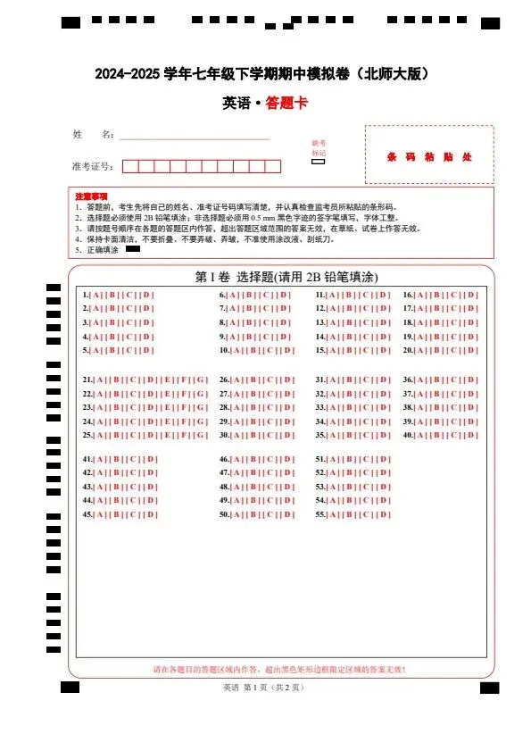 新26春七年级下册英语北师版期中试卷(答案+答题卡)完整电子版可打印!家长关注收藏,让孩子用高效的方法学透知识点,用优质的资源为学习赋能,在成长的赛道上稳步前行,轻松提分!