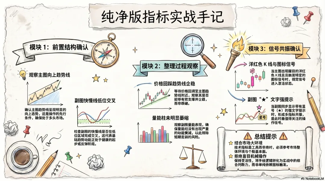 信号共振确认:当主图出现洋红色 K 线与图标信号,且副图出现★强文字提示时,可作为关注信号。