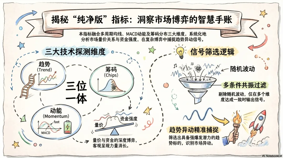 本指标通过融合多周期均线趋势、MACD 类快慢线、筹码成本分布三大维度的技术分析,综合计算价格动能与资金强度,通过多条件共振筛选出潜在的趋势异动标的,客观呈现市场量价与筹码的博弈状态。
