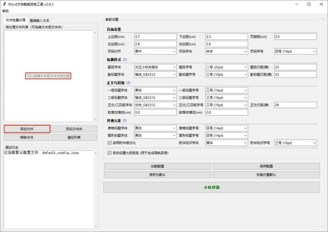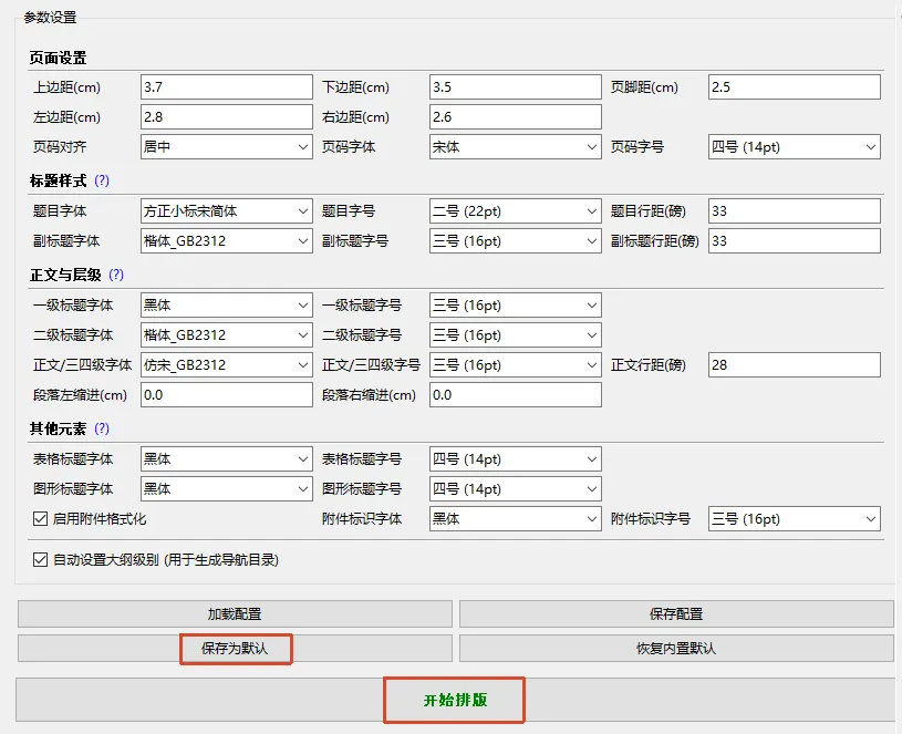 办公文档一键智能排版工具 写各种材料时除了要花大量时间组织内容,还得按照页边距、字体字号、行间距等格式要求对文档调来调去。今天分享一款“偷懒神器”,可以按要求对文档一键智能排版,把我们从这些繁琐重复的工作中解救出来。 使用方法: 1.安装: 本工具双击直接运行,不用安装 2.使用: 点添加文件/文件夹,或直接拖拽文件/文件夹 设置参数(工具默认了很多参数,简单修改并保存以后可直接使用) 点开始排版>选择保存位置>处理完成 查看效果 小贴示: 1.前提是电脑中已经安装了Word或Wps 2.提前安装好要用到的字体(如方正小标宋等) 工具获取方法: 下方公众号私信发送 一键排版 获取(建议复制后发送避免关键词错误影响接收)