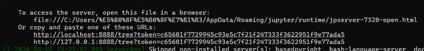 启动后终端会显示三个链接,任意点击一个即可在浏览器打开 Jupyter 界面。如图: