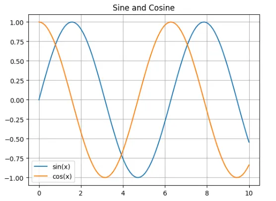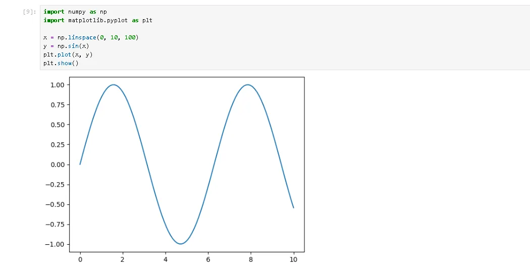 import numpy as npimport matplotlib.pyplot as pltx = np.linspace(0, 10, 100)y = np.sin(x)plt.plot(x, y)plt.show()