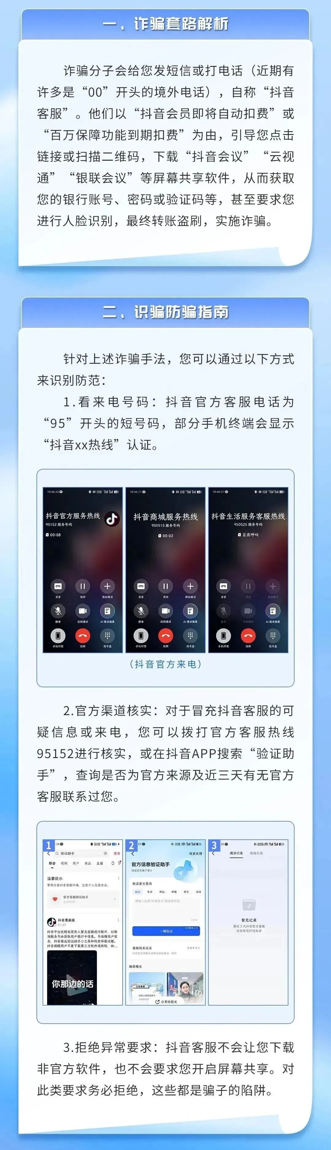 1. 坚守核实原则,主动拒绝:抖音等平台官方客服不会通过“取消会员扣费”方式联系用户,更不会要求下载软件或索取个人信息。若接到类似电话,请立即挂断电话,并自行通过APP内官方渠道或拨打官方客服电话核实账户状态。