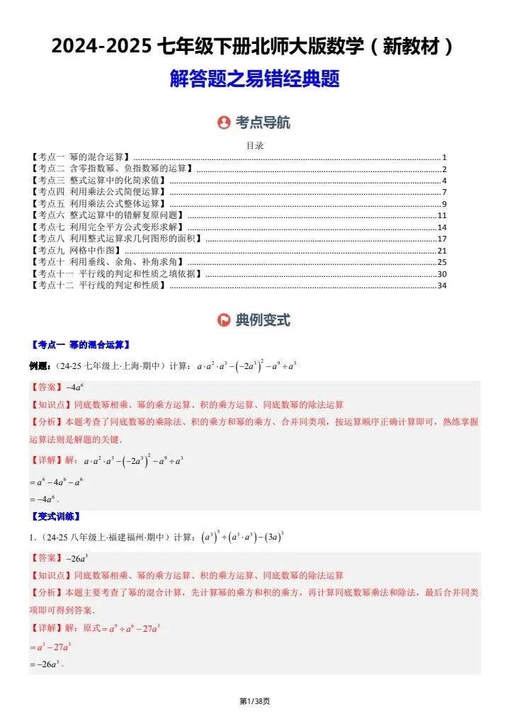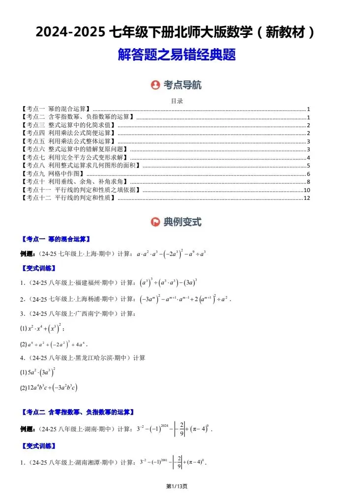 今日分享新七年级下册数学北师版期中复习·易错经典题(含答案)完整电子版可打印!高清可打印,每日轻量练习,拒绝无效刷题,用系统化资料筑牢学科基础,让假期成为提升的黄金期,开学轻松领跑。