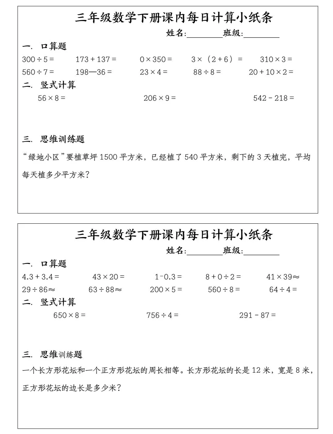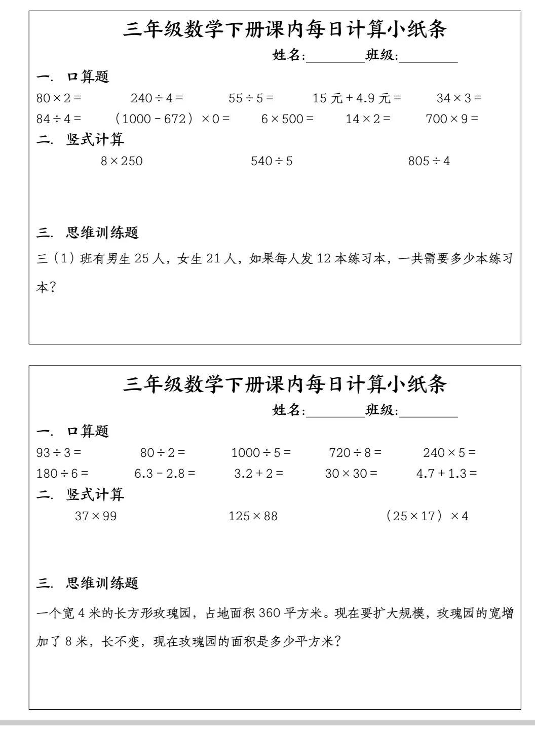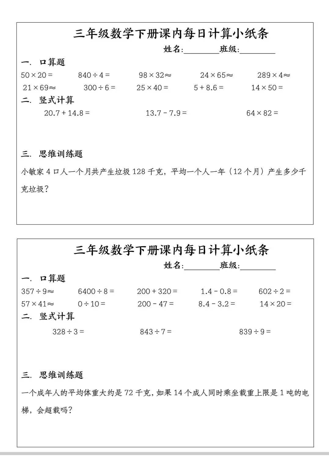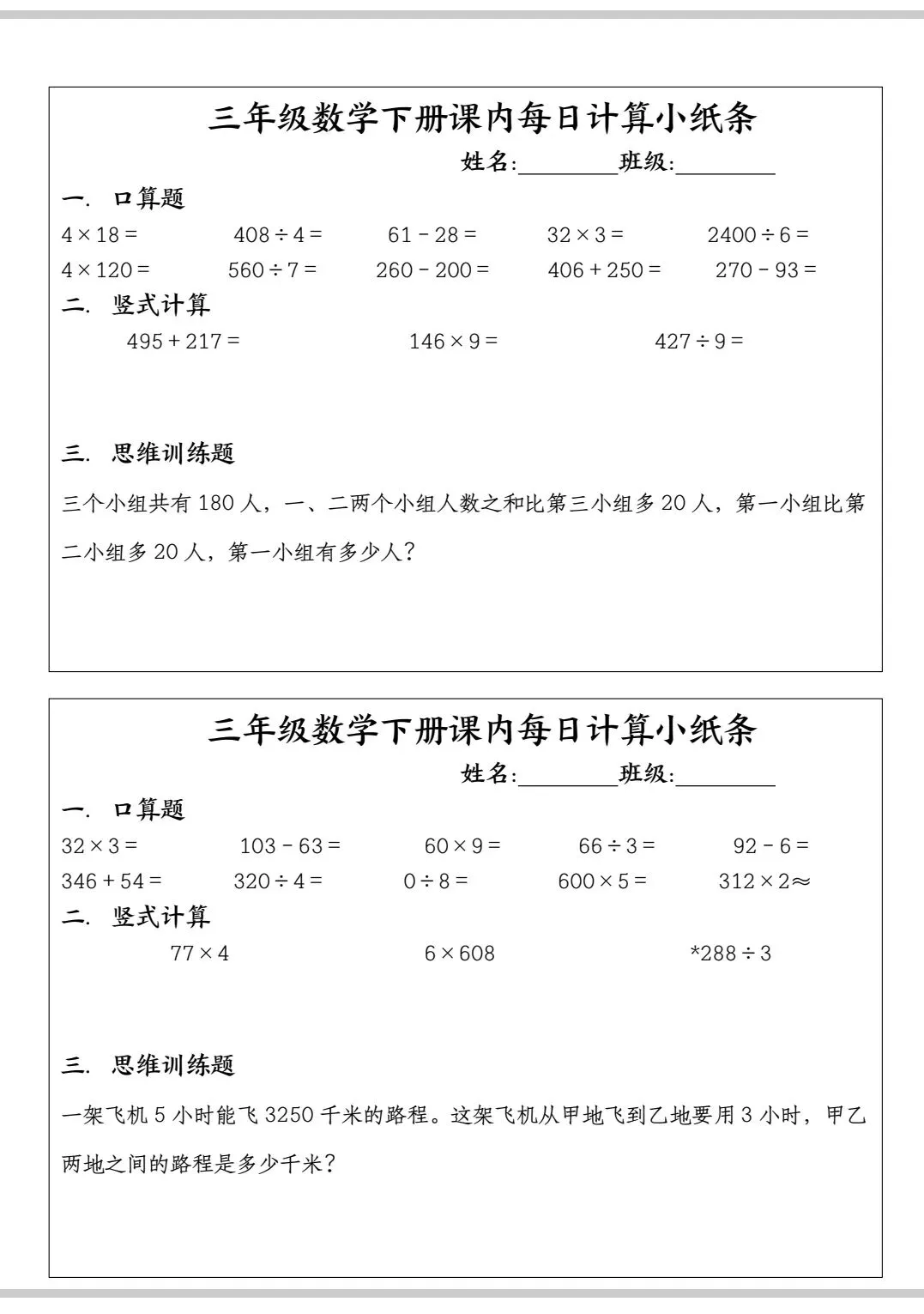 2026年数学人教版3年级下册每日一练,电子版可打印